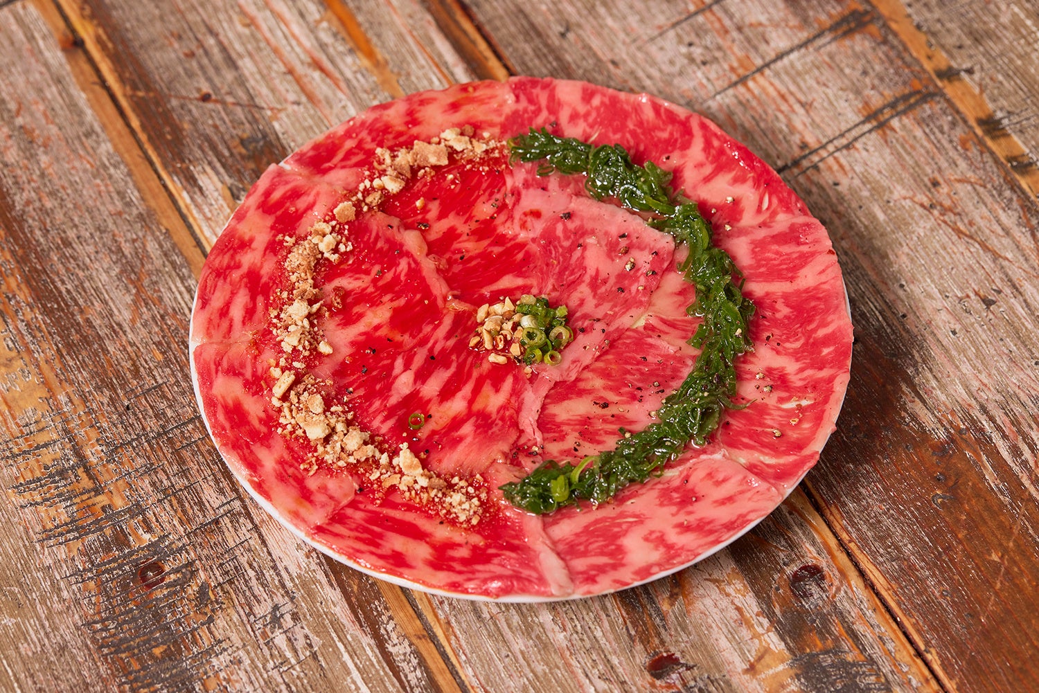 提供するお肉は、KINTANが長く信頼を置く食肉仲卸業者により、全国各地から優れた銘柄牛が集まる芝浦市場で買い付けされます。確かな目で買い付けされたA5ランク仙台牛をメインに地元の宮崎牛などを使い、和牛の違いをお楽しみいただけます。さらに福岡の皆様に、より親しみを持っていただけるよう九州の食材を使用した福岡店限定メニューを開発いたしました。焼肉KINTANを代表するメニューの“サーロイン・ユッケハーフ&ハーフ™”は自家製の醤油ダレとネギ塩ダレの2種類の味が楽しめるユッケです。自家製醤油ダレのユッケには、食感のアクセントに福岡銘菓の二○加煎餅を使用。サクサクした歯ざわりと卵の風味がタレを調和し、サーロインの旨味を引き立てます。ネギ塩ダレのユッケには糸島ねぎを使用。熱い油をかけて糸島ねぎの香りを引き立てることで、サーロイン・ユッケを最後までさっぱりとお召し上がりいただけます。その他、焼肉KINTANで人気の“クリームチーズキムチ”をアレンジした“めんたいクリームチーズキムチ”や“宮崎牛ミスジの炙り握り”、KINTANが手掛ける表参道の人気カフェ〈CBC〉から“福岡県産あまおうのアイスサンド”など9種の福岡店限定メニューが新登場いたします。さらに期間限定で福岡店限定メニューを含む「福岡焼肉kintanオープン記念コース」を特別価格の8,980円にて販売いたします。