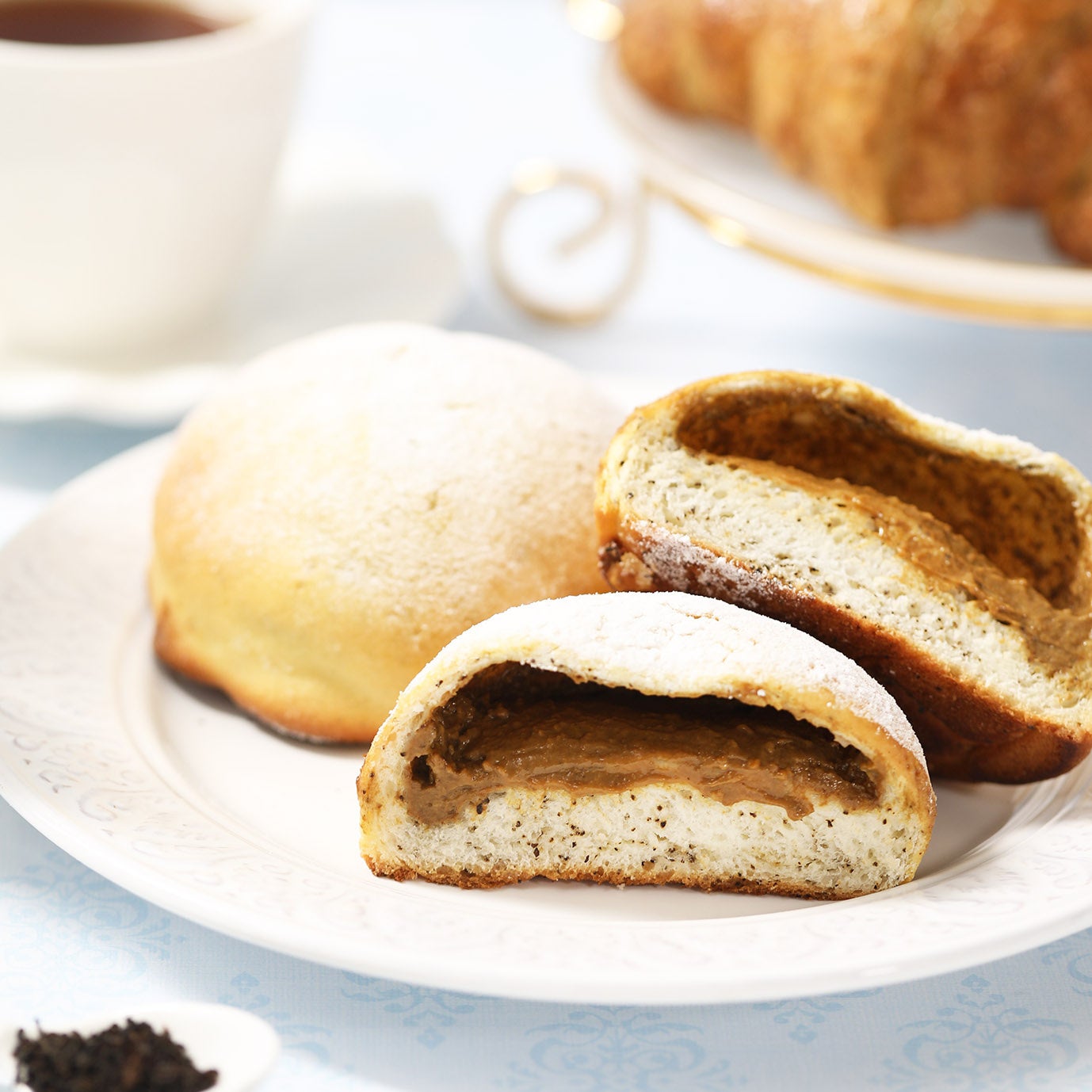 香り高いアールグレイ茶葉を練り込んだミルク生地で、アールグレイ風味のカスタードクリームを包み、クッキー生地をトッピングして焼き上げました。爽やかなアールグレイの風味とカスタードのまろやかな甘味が後を引くおいしさ。アールグレイづくしのクリームパンです。