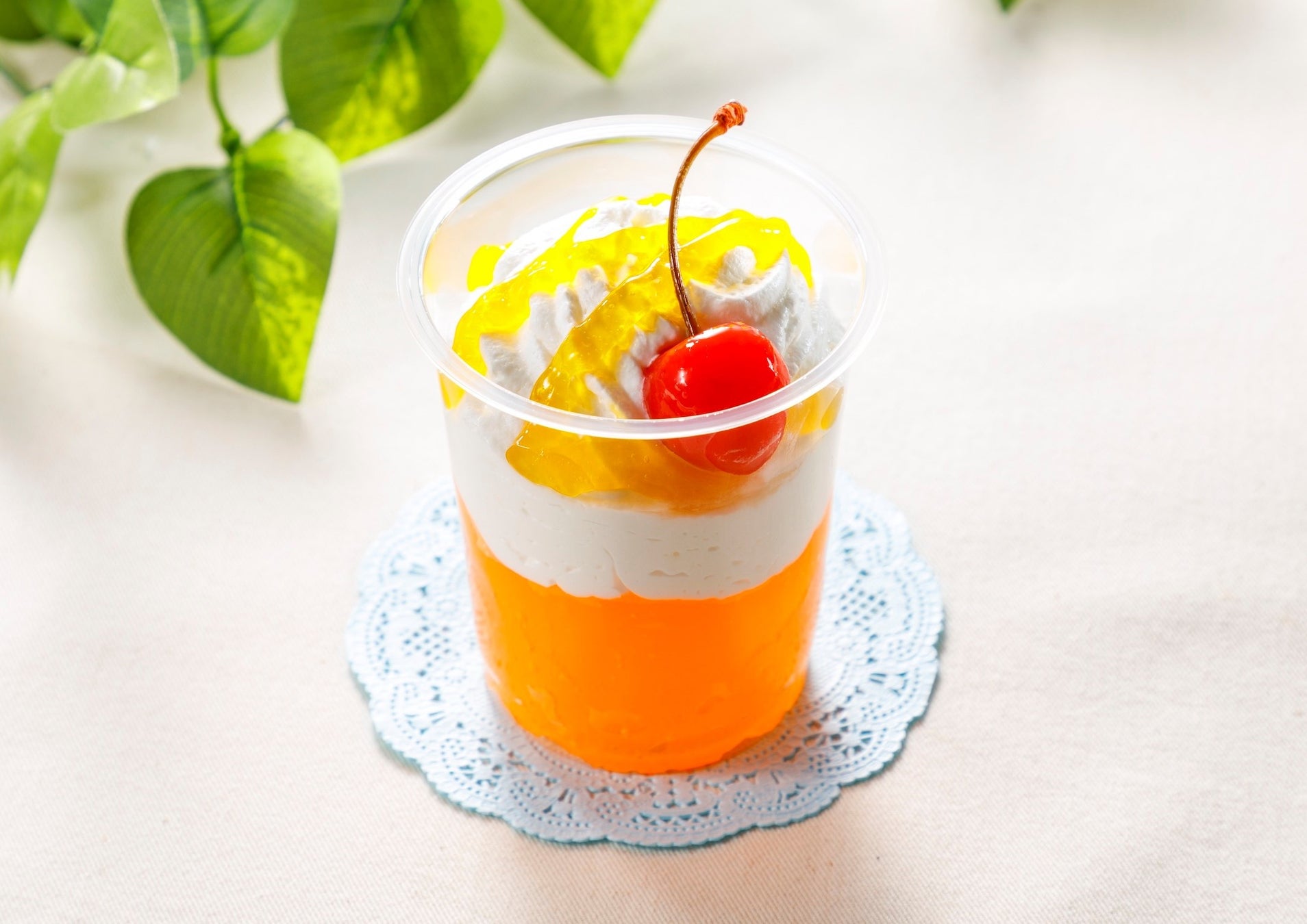 北海道産赤肉メロンピューレを使用したクラッシュメロンゼリーに、北海道産生クリームを配合したホイップクリームをたっぷり絞っています。トッピングには北海道産赤肉メロンジャムのソースと人気の枝付きチェリーを乗せて、目を引く見た目の“シメパフェ”※4)を表現しました。