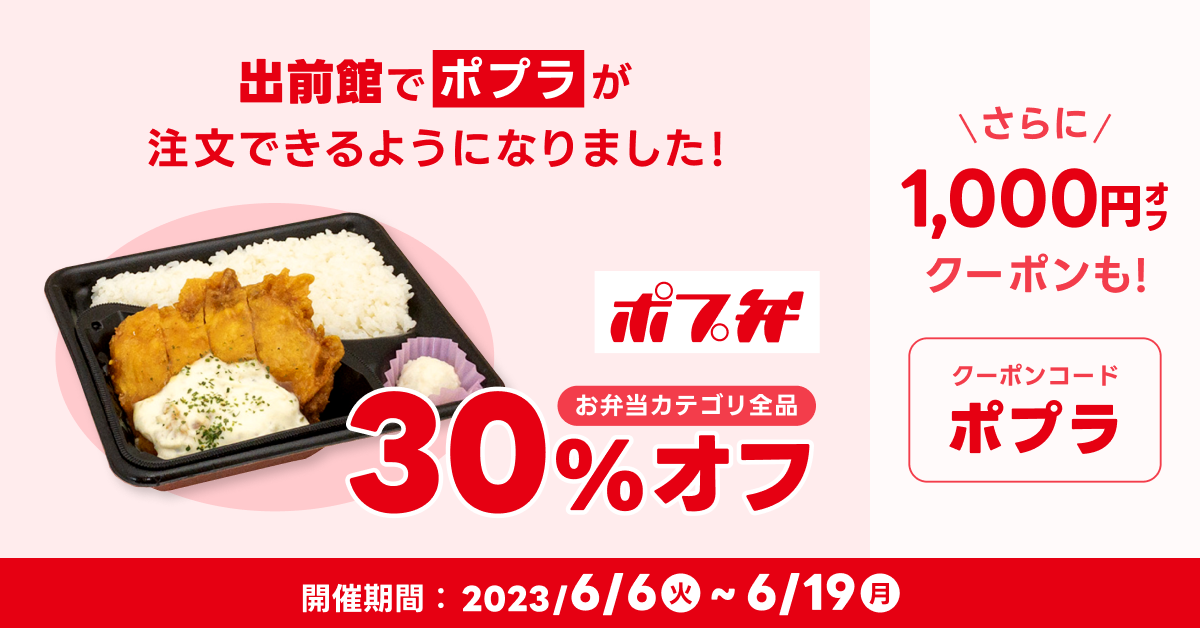 期間中、『出前館』から「ポプラ」のお弁当カテゴリが全品30%オフ+初めてご注文される先着3,000名さま限定!クーポンコード入力で2,000円以上のご注文が1,000円オフとなります。