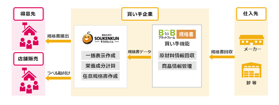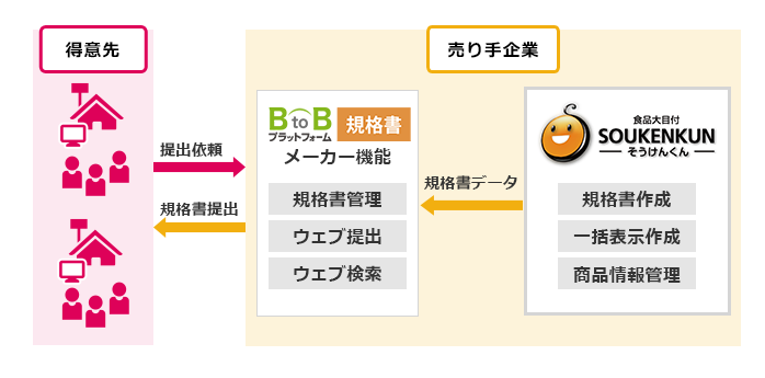 そこでこの度、外食企業や食品メーカー等、数多くのユーザーより要望を受け、当社の「BtoBプラットフォーム 規格書」とエフシージー総合研究所の「食品大目付そうけんくん」のデータ連携が実現しました。