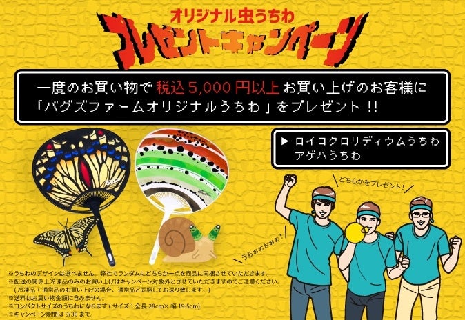 バグズファーム( https://bugsfarm.jp/ )にて一度のお買い物で税込5,000円以上お買い上げいただいたお客様に限り「バグズファーム特製オリジナル虫うちわ」を1種類プレゼントいたします。