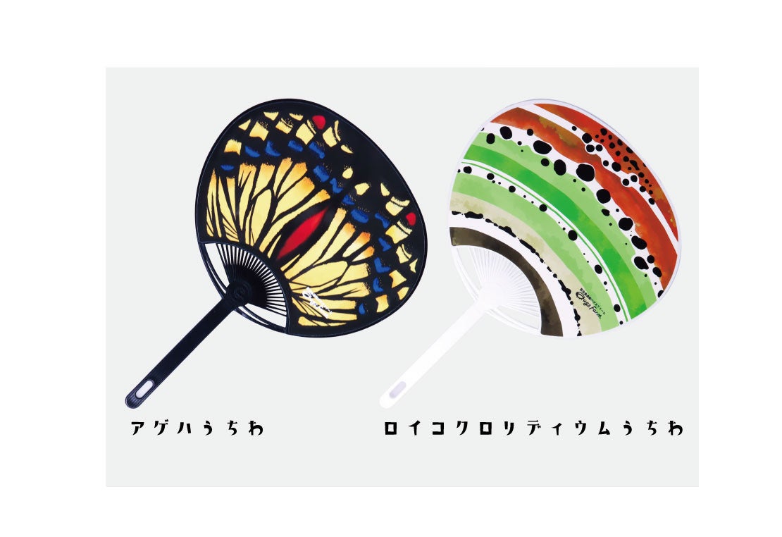 「バグズファーム特製オリジナル虫うちわ」アゲハ、ロイコクロリディウムの2種類のうち、どちらか1種類。