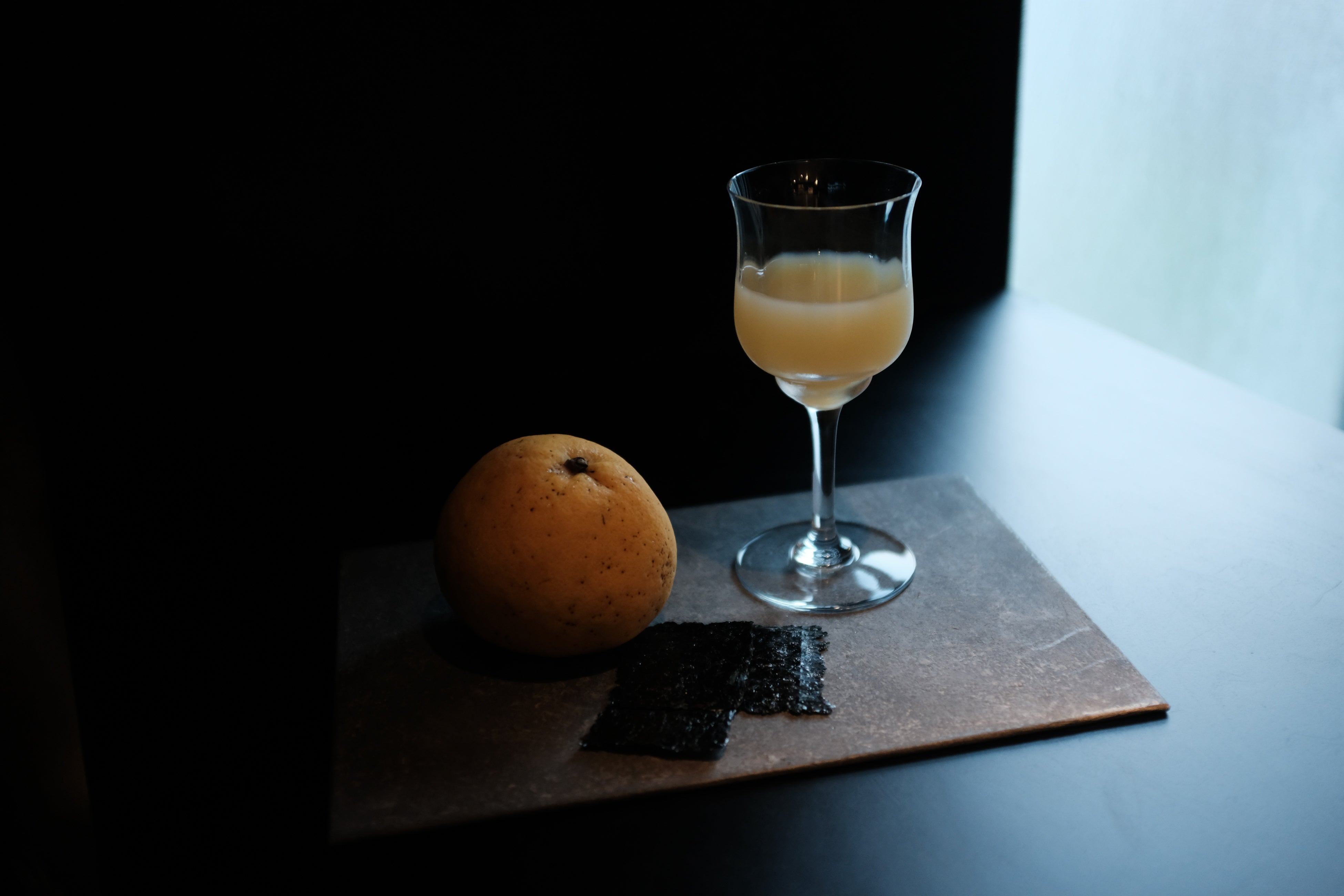 オープニングシーズンにご提供するドリンクのひとつ「汐」は、海苔のつくられる過程を表現したもので、浅草の老舗海苔店「ぬま田海苔」とのコラボーレーションとなります。美味しい海苔の生育に欠かせない豊かな海は、そこに流れ込む川や、その土壌をつくる山と森の豊かさによって支えられています。この自然の恵みと循環を、一杯のグラスに表現しました。ドリンクを構成するのは海苔の出汁と、大地の恵みである麹、柑橘、米酢。最後に上から「アオノリ混ざりの海苔」の粉を振りかけて仕上げます。