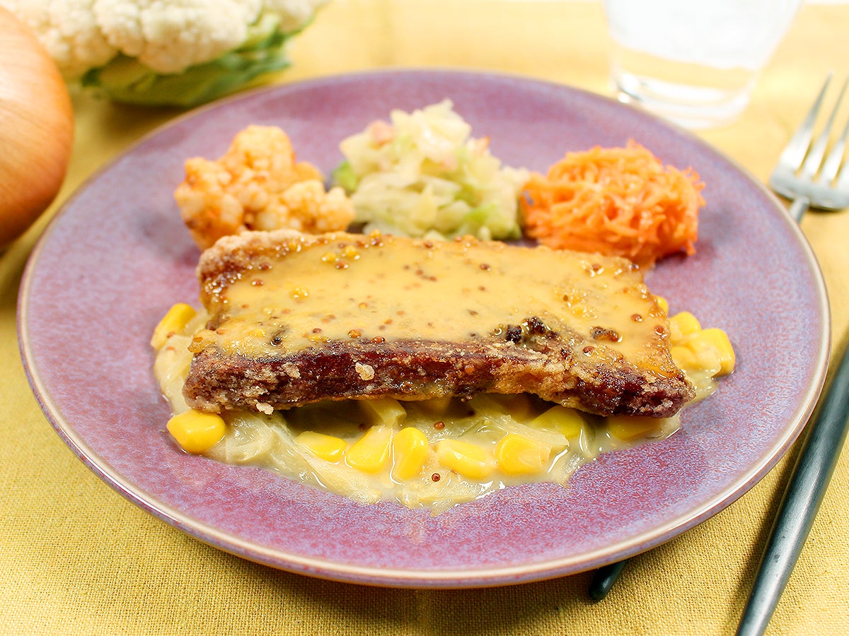 甘酸っぱいハニーマスタードソースを、豚バラ肉のフライを合わせたパワフルなプレートに仕上げました。付け合わせには相性の良いコーンとオニオンを添えました。ナッシュバンズパンに挟めば、より一層美味しくお召し上がり頂けます。