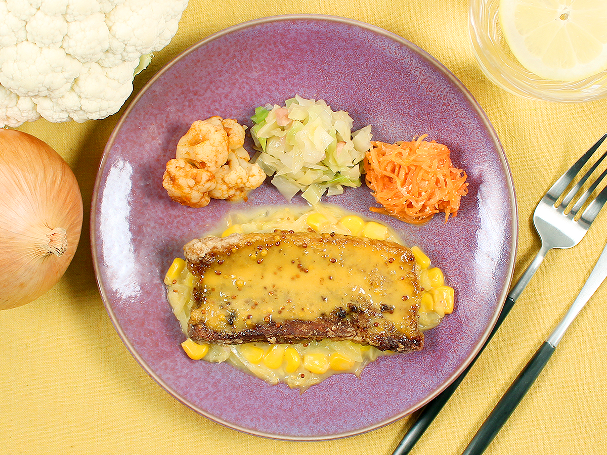 甘酸っぱいハニーマスタードソースを、豚バラ肉のフライを合わせたパワフルなプレートに仕上げました。付け合わせには相性の良いコーンとオニオンを添えました。ナッシュバンズパンに挟めば、より一層美味しくお召し上がり頂けます。