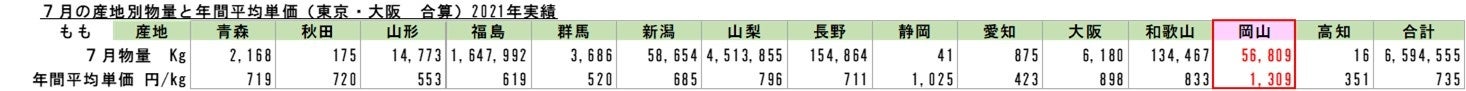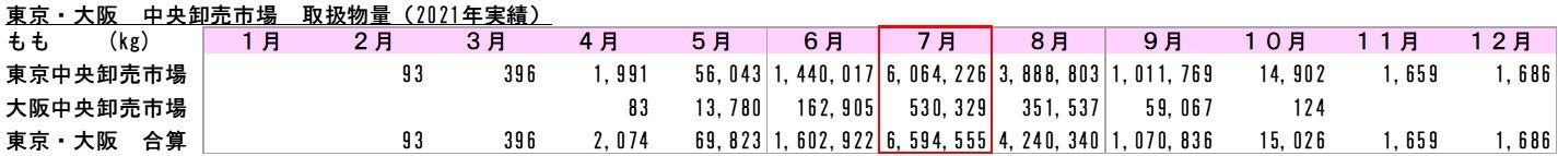 当社で東京都中央卸売市場と大阪府中央卸売市場の「もも」の物量と金額を調べましたところ、