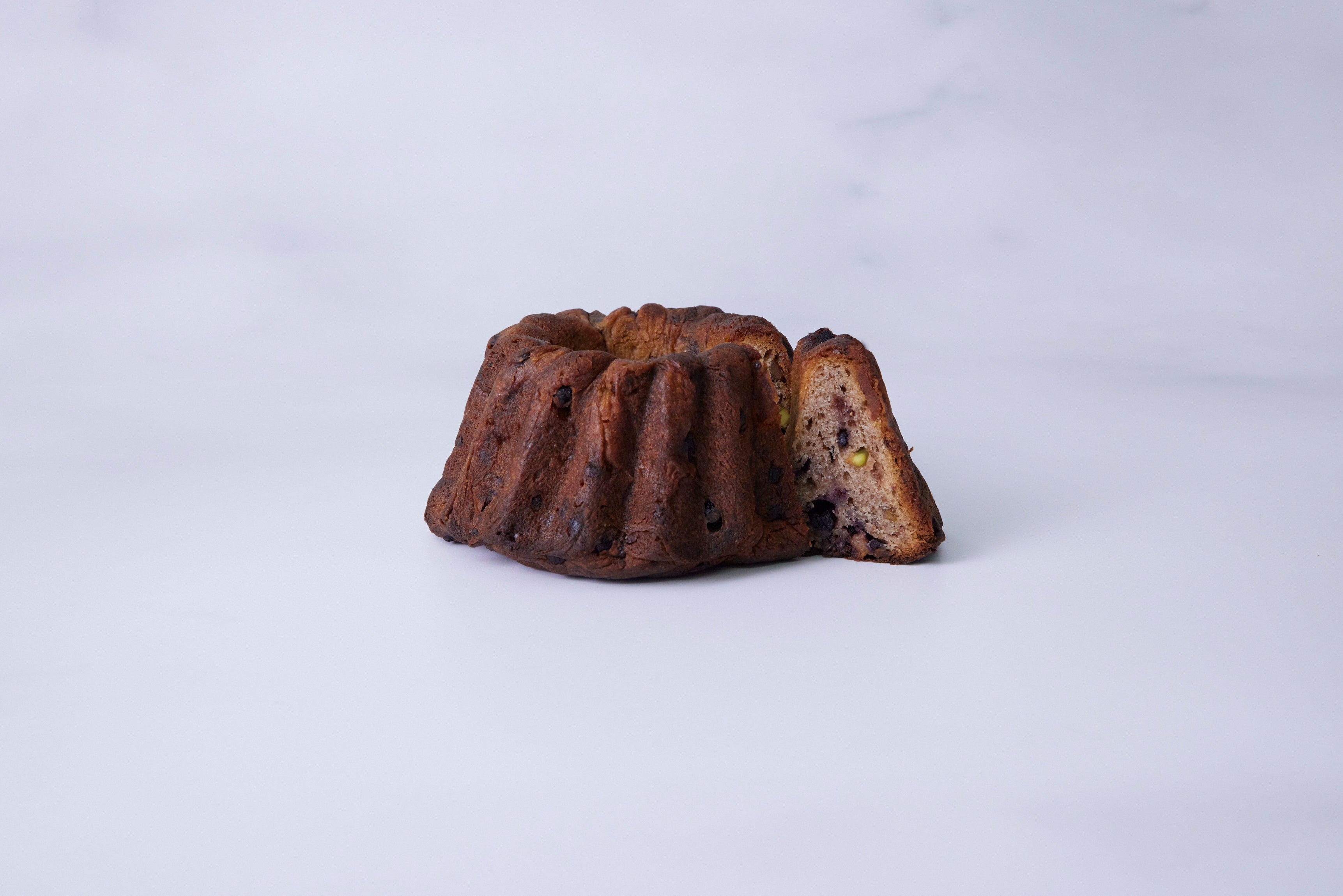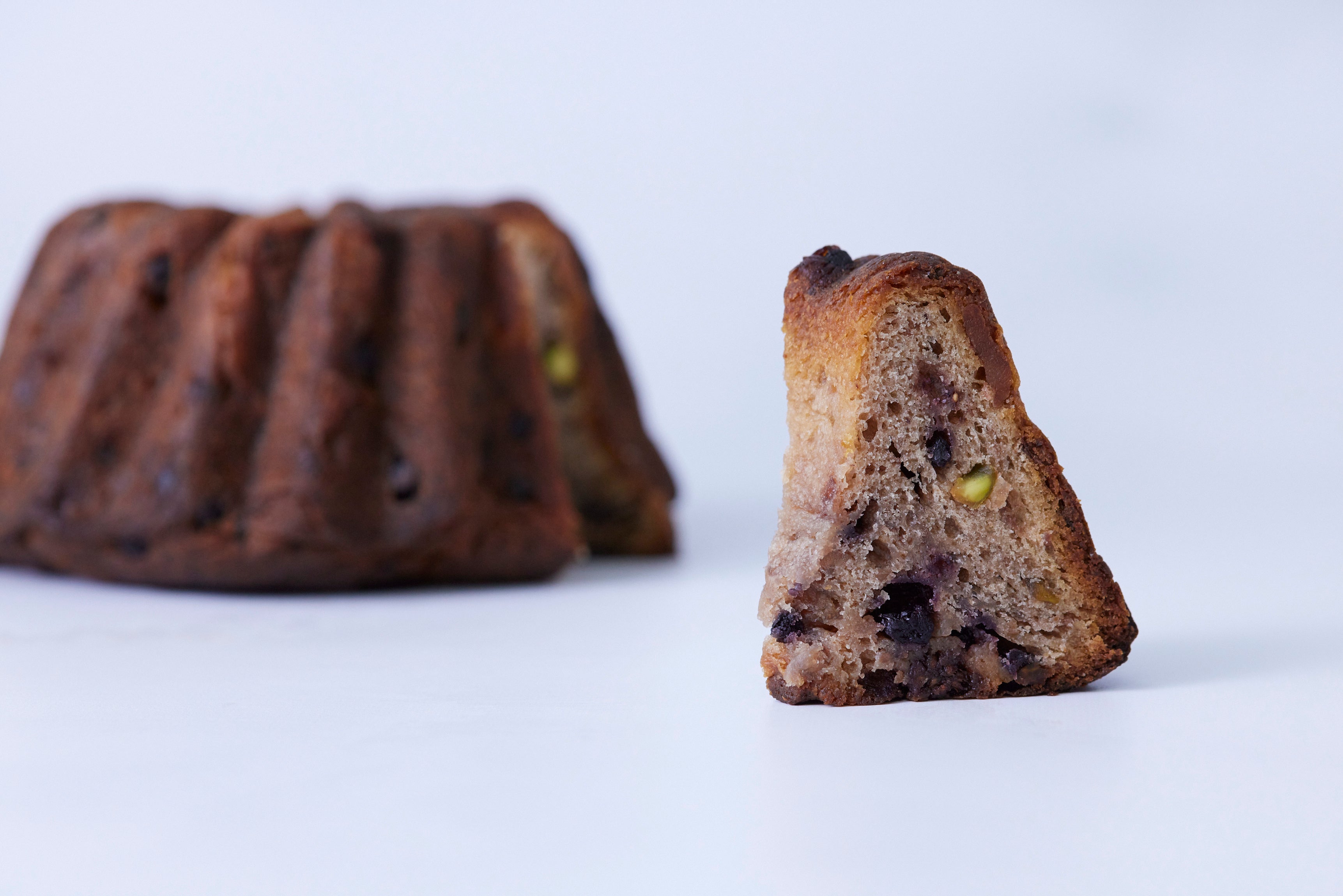 自家製酵母を使用し、赤ワインを入れて焼きあげた生地は、しっとりと口どけの良い食感に。具材には、2種類の洋酒漬けしたフランボワーズとブルーベリー、クルミとピスタチオを入れ、フルーツの甘酸っぱさとナッツの香ばしさが赤ワインの香りと調和し、後を引く美味しさです。