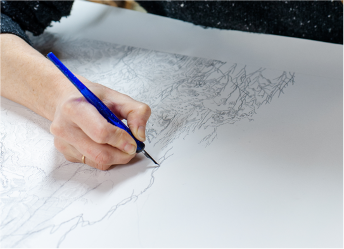 森のモニュメントを表現したカードボード彫刻が有名な彼⼥ですが、墨絵も彼⼥の作品において重要な役割を担っています。単なる下絵ではなく、それ⾃体が芸術作品です。今回の「カルト・ブランシュ」では、浮き彫り地図や地図製作に着想を得て、キャンバスにレリーフ状の絵を描いたシリーズを制作しました。