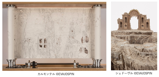 カードボード製の「プティシェドーヴル」(⼩さな傑作)を制作。この名前は、過去と現代の職⼈の傑作にちなんでいます。このシリーズは、シャンパーニュのテロワールをミニチュア化したような作品とし、来場者を⽬で⾒て歩かせ、ある世界から別の世界へと誘います。2つのレベルで構成された彫刻は、⾃然の⾵景とルイナールの⽩亜の地下セラーを想起させる建築物が並べられています。