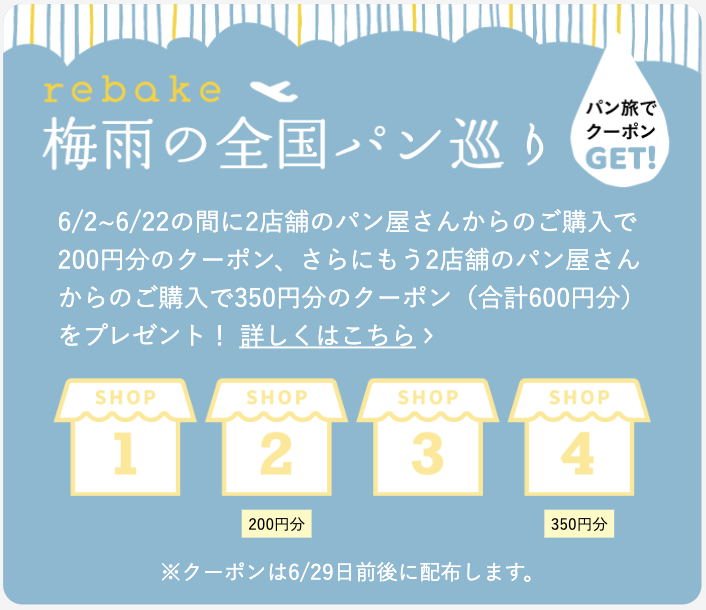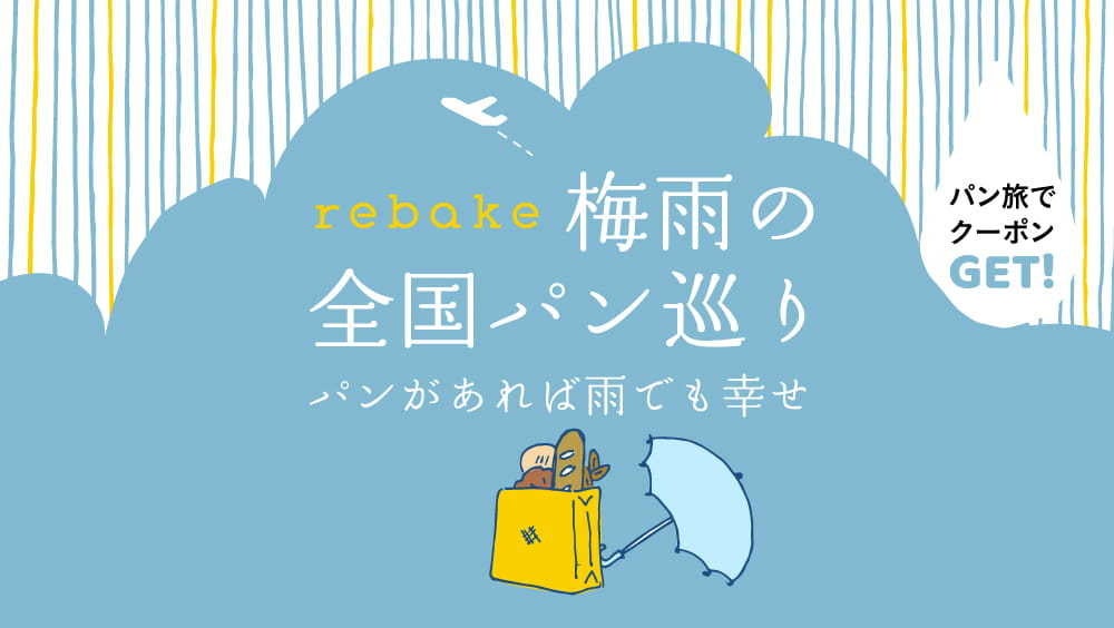 梅雨は、パン屋さんにとって大敵です。梅雨のこの時期は、不安定な天気のせいで外出機会が減り、来客数も落ち込んでしまうことで、一年で最もロスが増える時期となります。お店から足が遠ざかるので、家の中でパンを楽しむ機会も必然的に減ってしまいます。そんな梅雨の時期に、少しでも様々なパンに出会ってロスパンを減らすべく、「梅雨のパン巡りキャンペーン」を開催します!お店に足を運ばなくてもrebakeなら全国各地のパン屋さんのパンが購入できます。