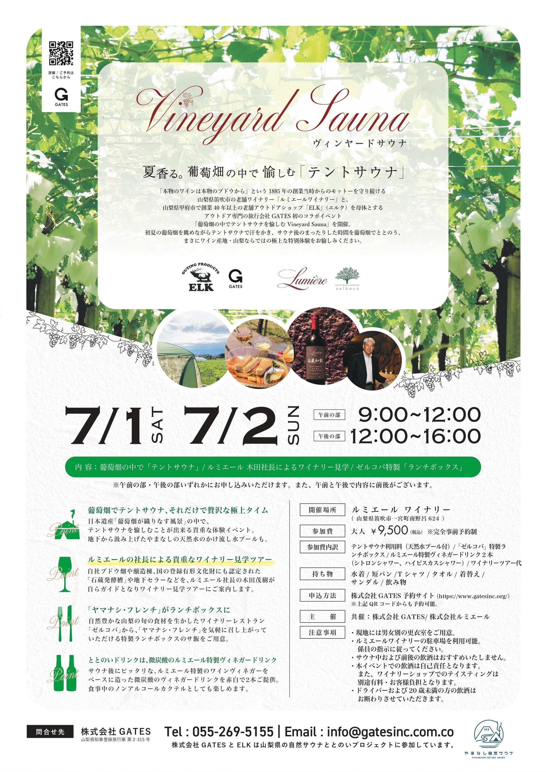 山梨県甲府市で創業40年以上の老舗アウトドアショップ「ELK」(エルク)を母体とするアウトドア専門の旅行会社、株式会社GATES(所在地:山梨県甲府市、代表取締役社長:柳澤隆広)と、「本物のワインは本物のブドウから」という1885年の創業当時からのモットーを守り続ける山梨県笛吹市の老舗ワイナリー「ルミエールワイナリー」と隣接地にヤマナシ・フレンチを提供するワイナリーレストラン「ゼルコバ」を営む、株式会社ルミエール(所在地:山梨県笛吹市、代表取締役社長:木田茂樹)は、両社初のコラボイベントとして、日本遺産(※)「葡萄畑が織りなす風景」の中でテントサウナを愉しむことが出来る「Vineyard Sauna」(ヴィンヤードサウナ)イベントを2023年7月1日(土)・2日(日)の2日間、それぞれ午前と午後に開催いたします。梅雨明け後の初夏の太陽でぐんぐんと生育した葉や枝で覆われ葡萄の粒も大きくなってきた葡萄畑を眺めながらテントサウナで汗をかき、サウナ後のまったりした時間を葡萄畑でととのう、まさにワイン産地・山梨ならではの極上な特別体験をお愉しみください。