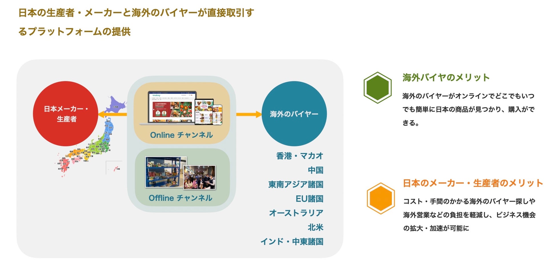 バイヤーや消費者は、日本各地のメーカー及び生産者の商品をオンライン上で取引可能でああり、更に実店舗で取引するも可能になります。また、対面接客での各種フェアやプロモーションイベント集客などを積極的に行い、プラスの相乗効果や長期的展望にも繋がります。