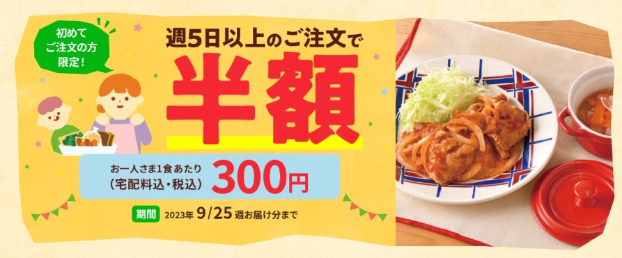これから「PAKU MOGU」を始める方は、週5日以上のご注文でお1人さま1食あたり300円でご注文できる「半額キャンペーン」をご利用いただけます。初回お届けの1週分、おトクな価格でお試しいただけますので、ぜひこの機会にご利用ください。