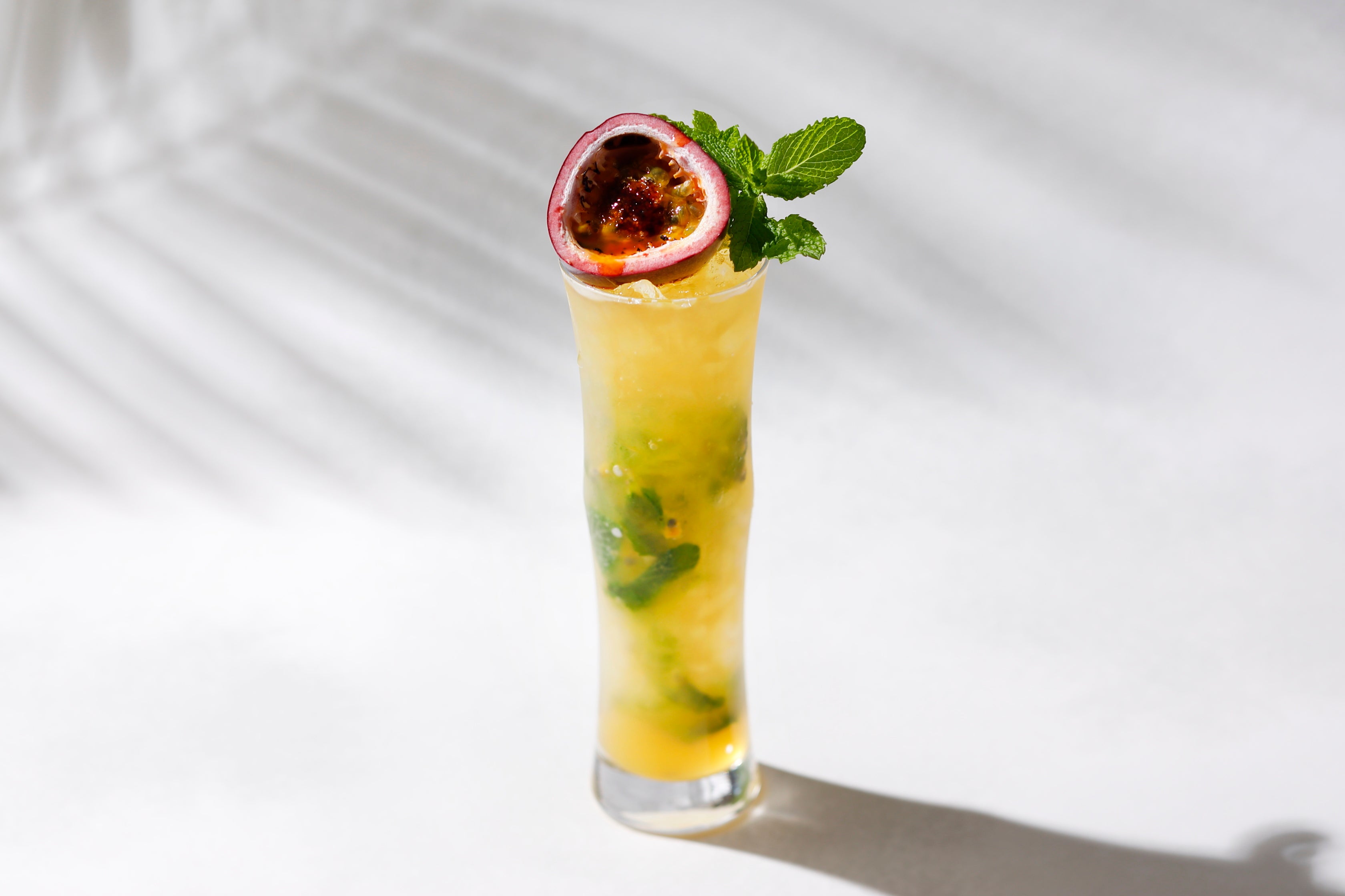 華やかな香りで魅了するパッションフルーツを、エイジドラムと柑橘系のジュースと合わせた鮮やかな見た目のカクテル。ガーニッシュには、果肉をカラメリゼした甘く香ばしいパッションフルーツを乗せて仕上げました。乾いた喉に爽やかな酸味とミントの香りが突き抜け、夏の暑さを心地よく吹き飛ばす一杯です。