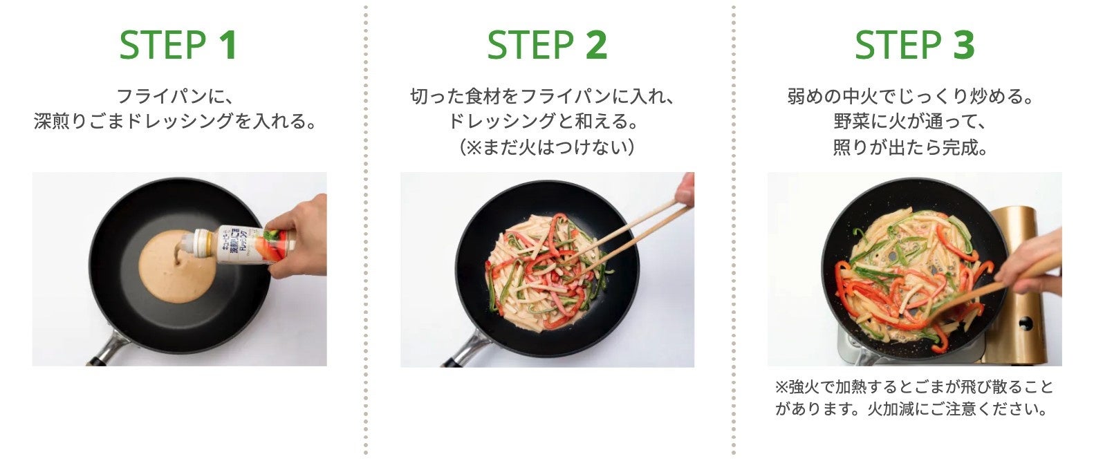 “深ごまチャオ”は、「深煎りごまドレッシング」を使って野菜を食べやすくした炒め物です。野菜とドレッシングをしっかりあえてから、弱めの中火でじっくり炒めると、ごまの風味がしみこみやすくなります。食材に火が通り野菜に照りが出てきたところで火を止めるのが、おいしい“深ごまチャオ”を作る秘訣です。野菜に甘みが増し、食べやすくなります。