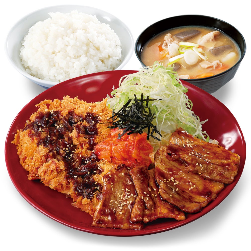 ボリューム満点なチキンカツと、ごま油がふわっと香る甘辛タレで焼き上げた厚切り豚カルビを合い盛りにしてキムチを添えた、梅雨が始まるこの時期も元気に過ごしていただきたいと願い誕生したパワーメニューです。