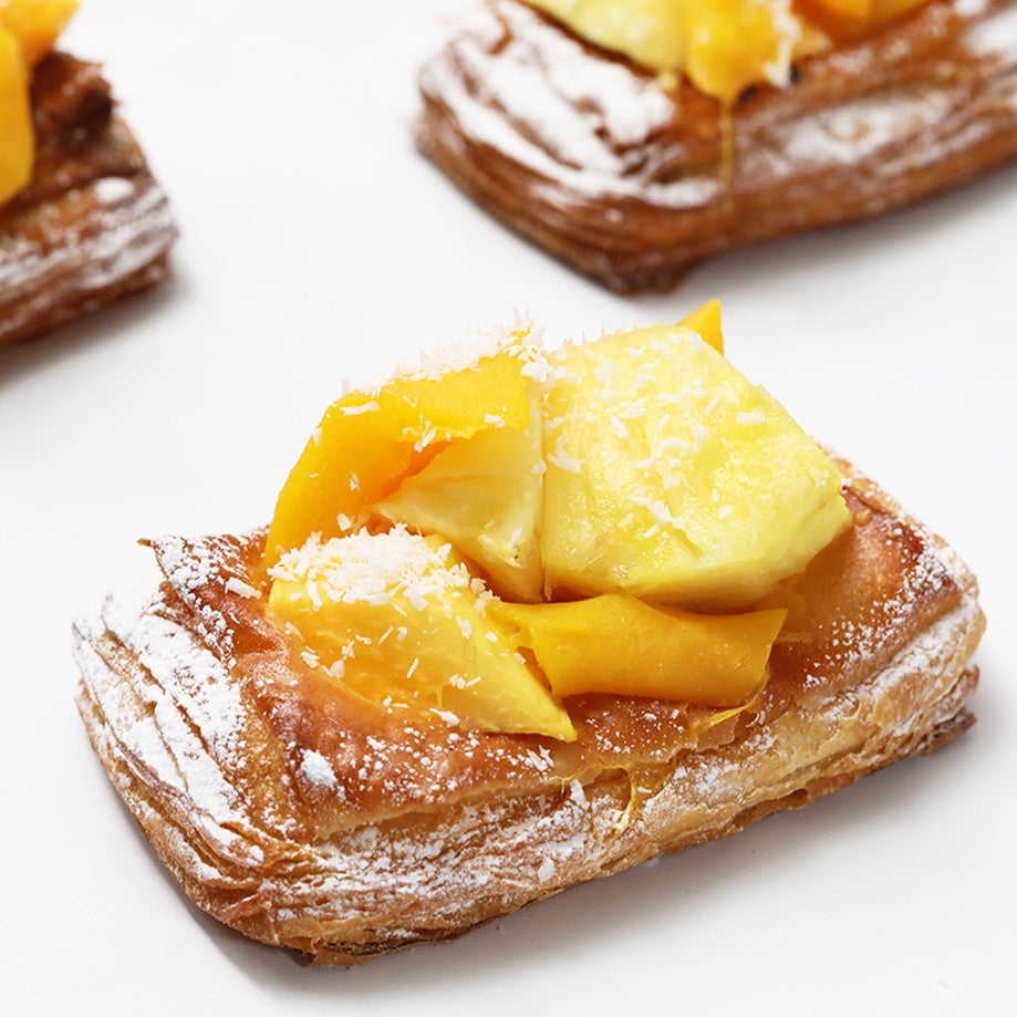 発酵バターを練りこんだ風味豊かなデニッシュ生地に、南国のフルーツ (マンゴー、パパイヤ、パイナップル) を盛り付け、仕上げにココナッツを飾りました。みずみずしく、フルーツの爽やかな甘さと酸味がカスタードクリームとよく合う夏限定のカラフルなデニッシュです。