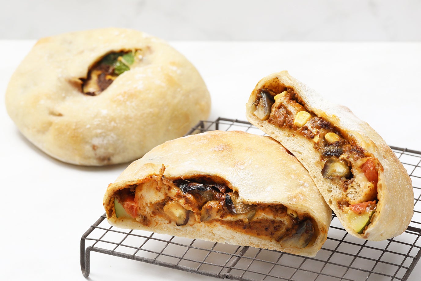 ・トマト、ナス、ズッキーニなど、ソテーした夏野菜がゴロゴロ入ったオリジナルのキーマカレーフィリングと、チーズを包んで焼き上げました。