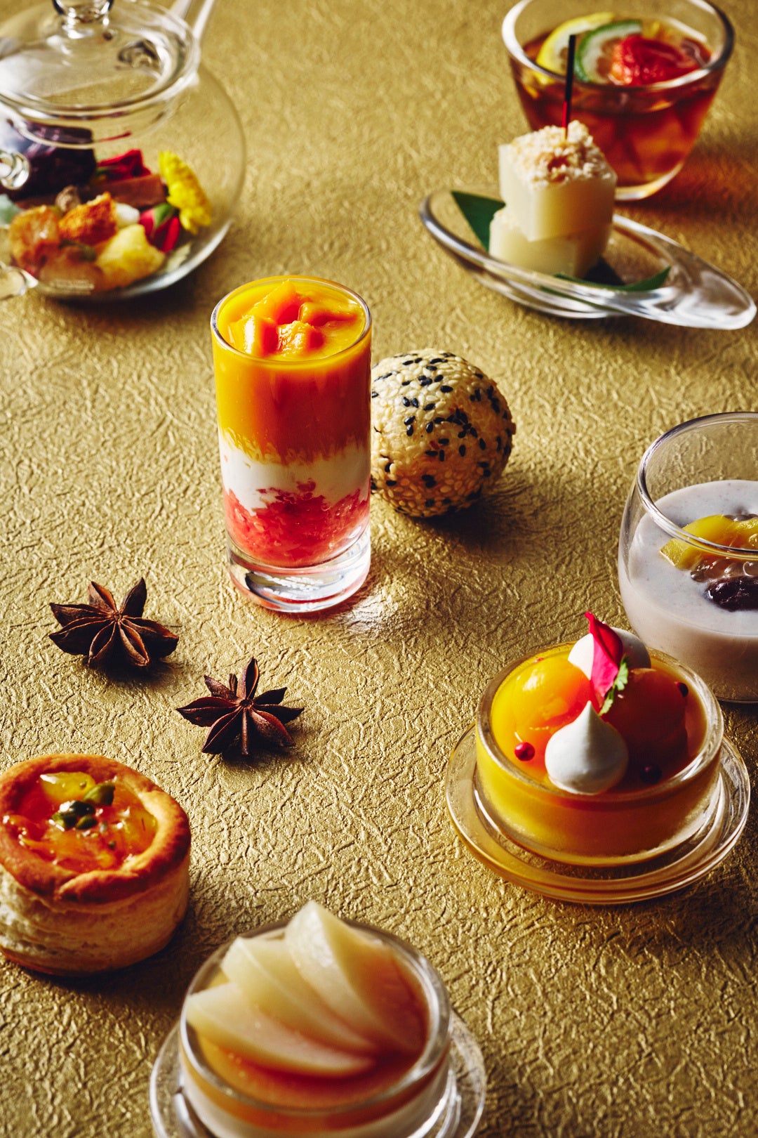 どれから食べるか迷うくらい、それぞれに個性豊かな至極のスイーツばかりを揃えました。ビジュアル、テクスチャー、テイスト、すべてが異なる10種のチャイニーズスイーツは、飽きることなく最後までお楽しみいただけます。