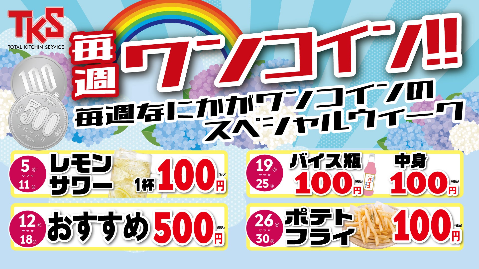 6月に入り、いよいよ梅雨本番!ジメジメした気分を少しでも吹き飛ばすべく、寿司屋や居酒屋などを運営する株式会社ティーケーエスでは、毎週何かがワンコインになるお得なイベント「ワンコインウィーク」を開催いたします!