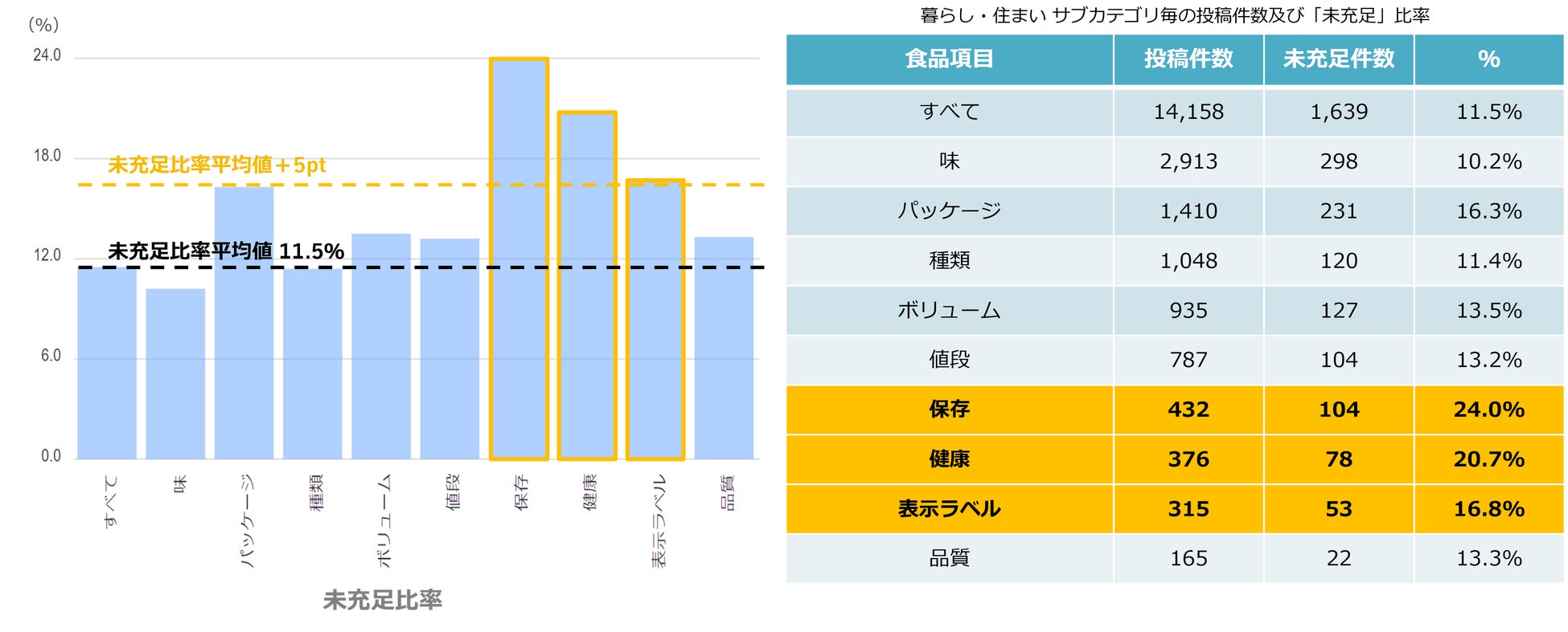 お惣菜の不満項目毎の「未充足」の投稿件数と比率を比較した。 l未充足不満の投稿件数は「味」「パッケージ」「ボリューム」が上位となった。 l未充足不満の比率は「保存」「健康」「表示ラベル」が全体平均の11.5%を5pt以上上回った。