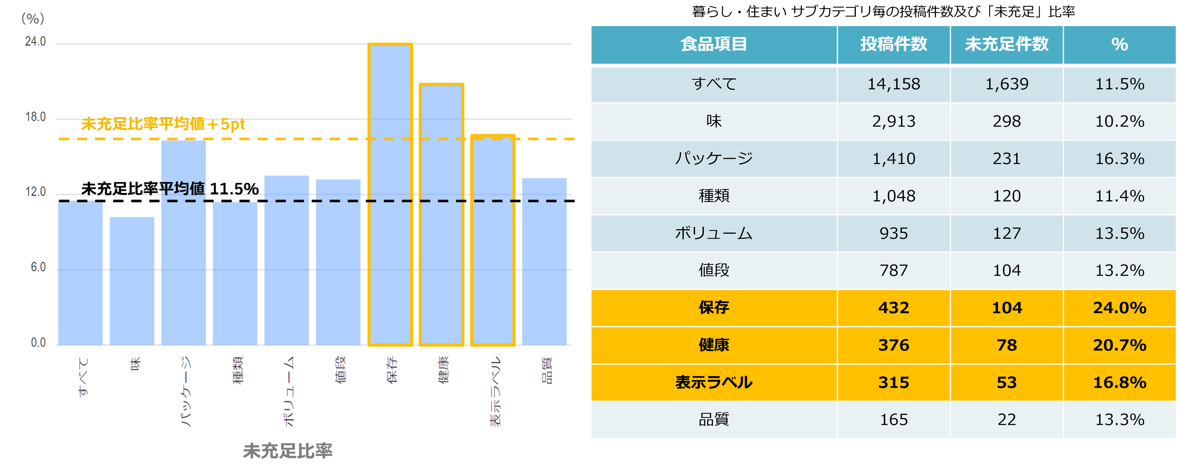 お惣菜の不満項目毎の「未充足」の投稿件数と比率を比較した。 l未充足不満の投稿件数は「味」「パッケージ」「ボリューム」が上位となった。 l未充足不満の比率は「保存」「健康」「表示ラベル」が全体平均の11.5%を5pt以上上回った。