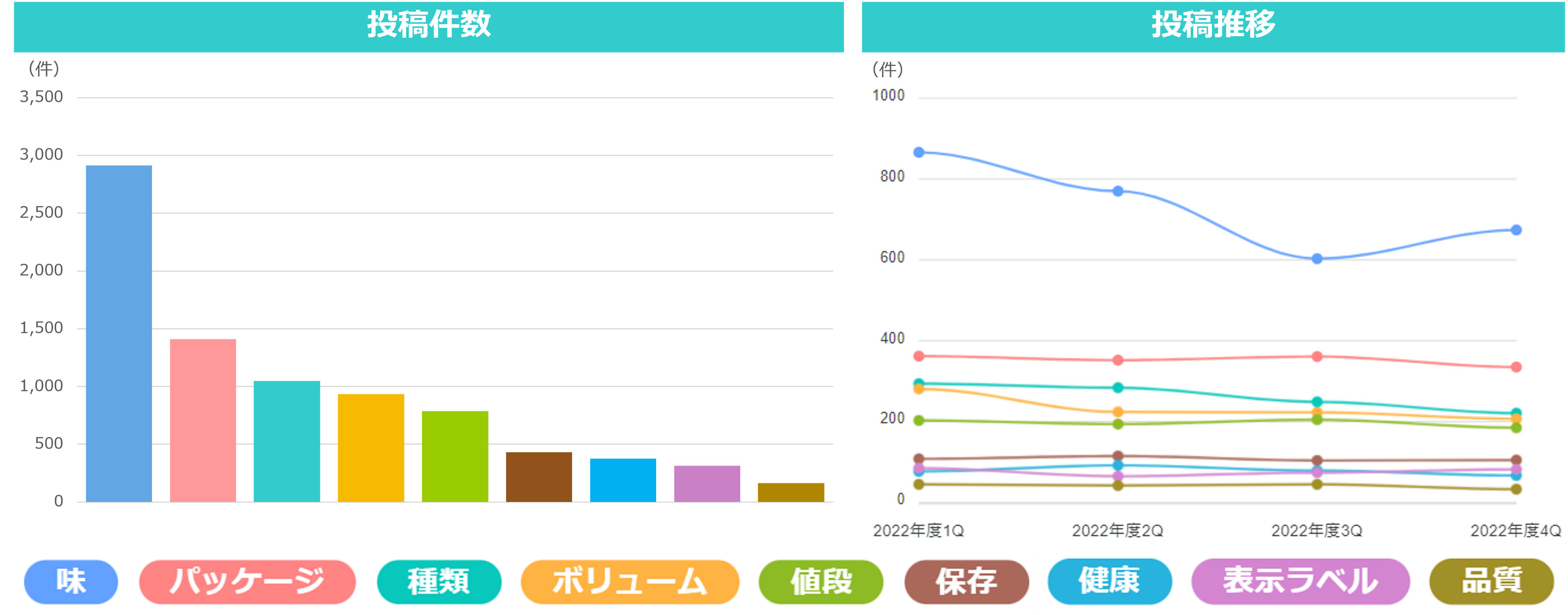 お惣菜の不満項目毎に見た不満投稿数は、1位 味、2位 パッケージ、3位 種類 と続いた。