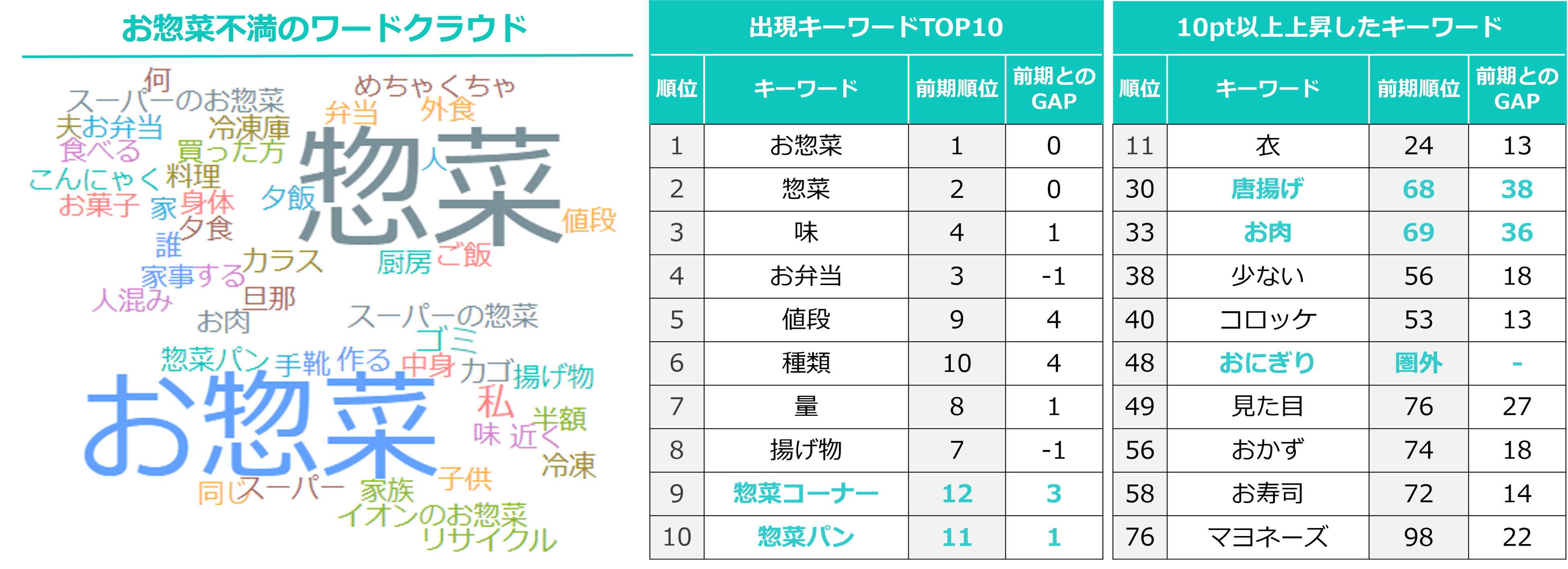 出現ワードランキングで新たにTop10入りしたものは「惣菜コーナー」「惣菜パン」。 l10pt以上順位を上げたキーワードの中でも特に顕著なものは、「唐揚げ」「お肉」「おにぎり」となった。