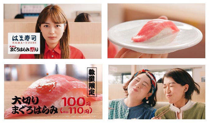 はま寿司では、6月8日(木)より、「はま寿司の大切りどでかネタ祭り」を開催します。新TVCM「大切りまぐろはらみ祭り はまい!」篇は、川口さんがフェアの目玉商品「大切りまぐろはらみ100円(税込110円)」の魅力を伝えます。