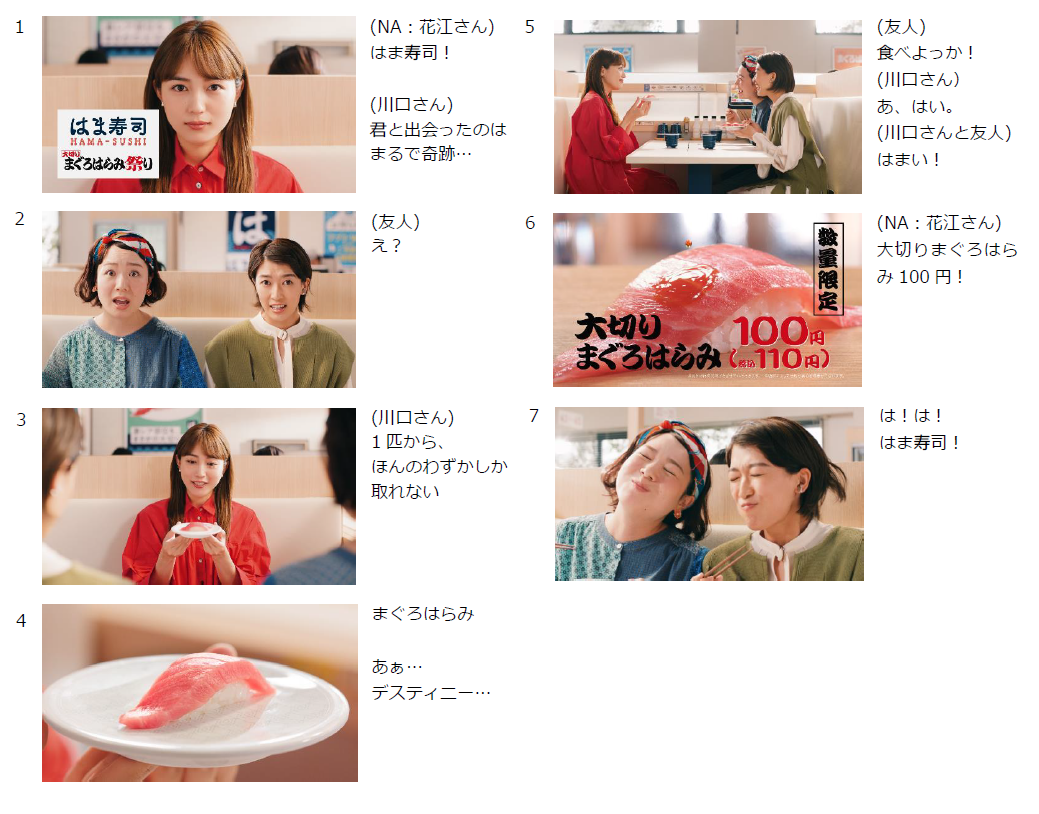 とにかくお寿司が大好きで、よく高校時代の気の置けない友人とはま寿司で食事をする川口さん。はま寿司のテーブル席で、「君と出会ったのはまるで奇跡…」と、1匹からほんのわずかしか取れないまぐろはらみの希少性を真剣な面持ちで語るシーンから始まります。困惑する友人に構わず、「あぁ…デスティニー…」とまぐろはらみに夢中になる川口さん。呆れた様子の友人が「食べよっか!」と声をかけ、川口さんが我に返るというコメディータッチなCMです。最後に、「大切りまぐろはらみ」を頬張り「はまい!」と声を揃える川口さんと友人2人の姿にご注目ください。