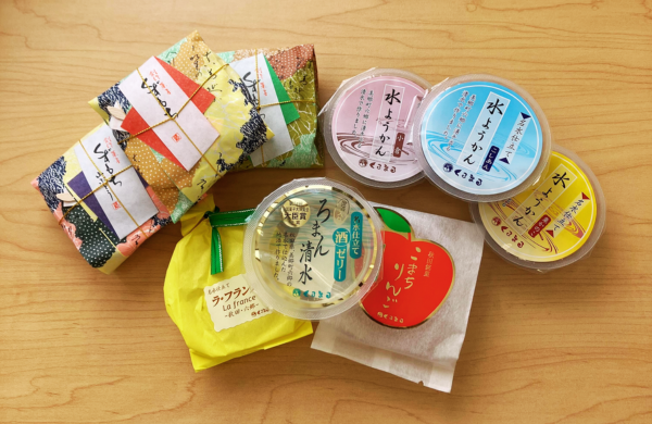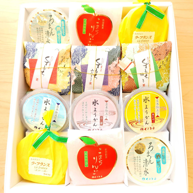 水ようかん(小倉・こしあん・栗かのこ 各1個)、くずもち(プレーン・山ぶどう・柚子 各1個)、ゼリー(こまちりんご・ラ・フランス・ロマン清酒 各2個)