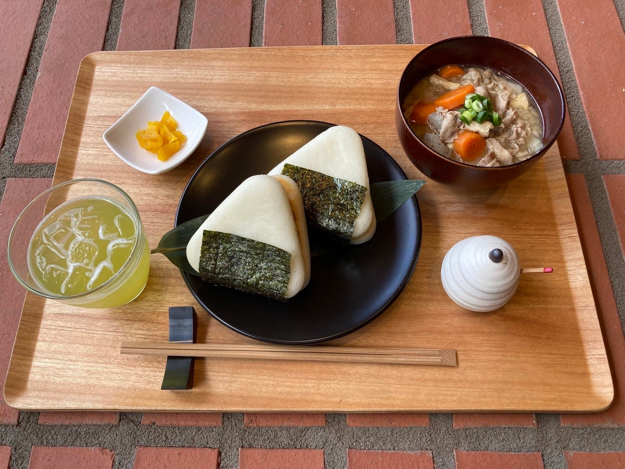 【商品説明】 食用油脂と米粉でつくった、ふわふわ、もちもち、しっとりとした食感のおにぎりパン2個、バターの甘みとコクを加えた具だくさんの豚汁、香の物、緑茶のセットメニューです。おにぎりパンの具は、シャケ、おかか、ツナマヨ、肉みそ、うめ、うめおかか、から選べます。