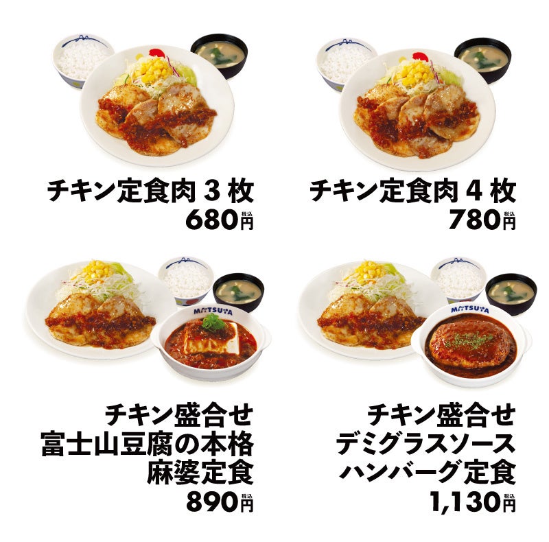 商品名 チキン定食 肉3枚 680円 チキン定食 肉4枚 780円 チキン盛合せ富士山豆腐の本格麻婆定食 890円 チキン盛合せデミグラスソースハンバーグ定食 1,130円 ※お持ち帰りいただけます。お持ち帰りにみそ汁は付きません。 お持ち帰りの場合、みそ汁は別途60円でお求めいただけます。 ※税込み価格です。 発売日 2023年6月13日(火)午前10時 ~ 対象店舗 一部店舗を除く全国の松屋 |