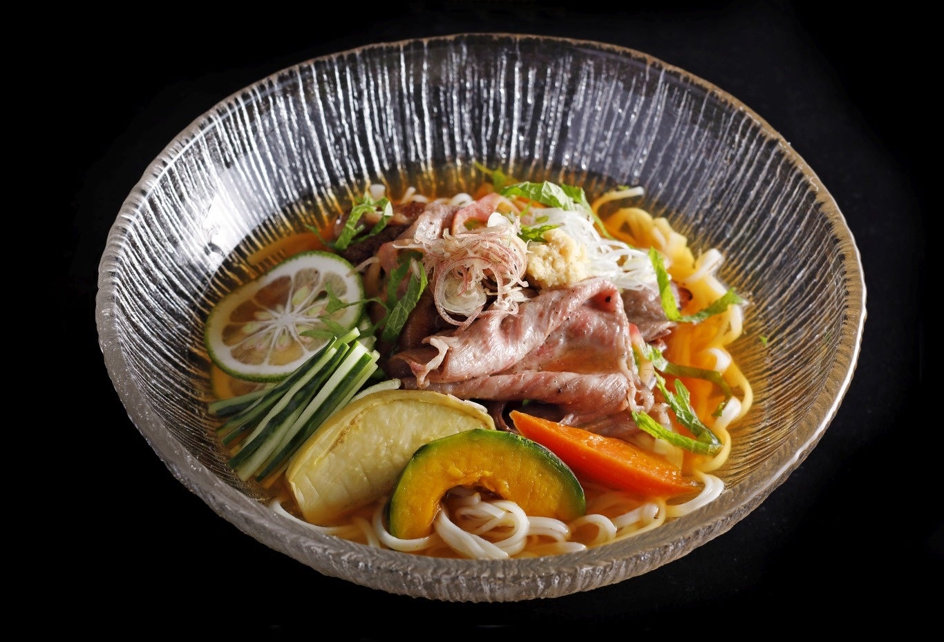 また、『鳥取和牛網焼きと冷製カボス稲庭うどん』は、網焼きした鳥取和牛を最高級のまぐろ節と京都の柔らかな天然水でとった上品な風味の出汁に、ビタミンたっぷりのカボスの酸味を効かせた、夏にぴったりの涼感溢れる逸品です。