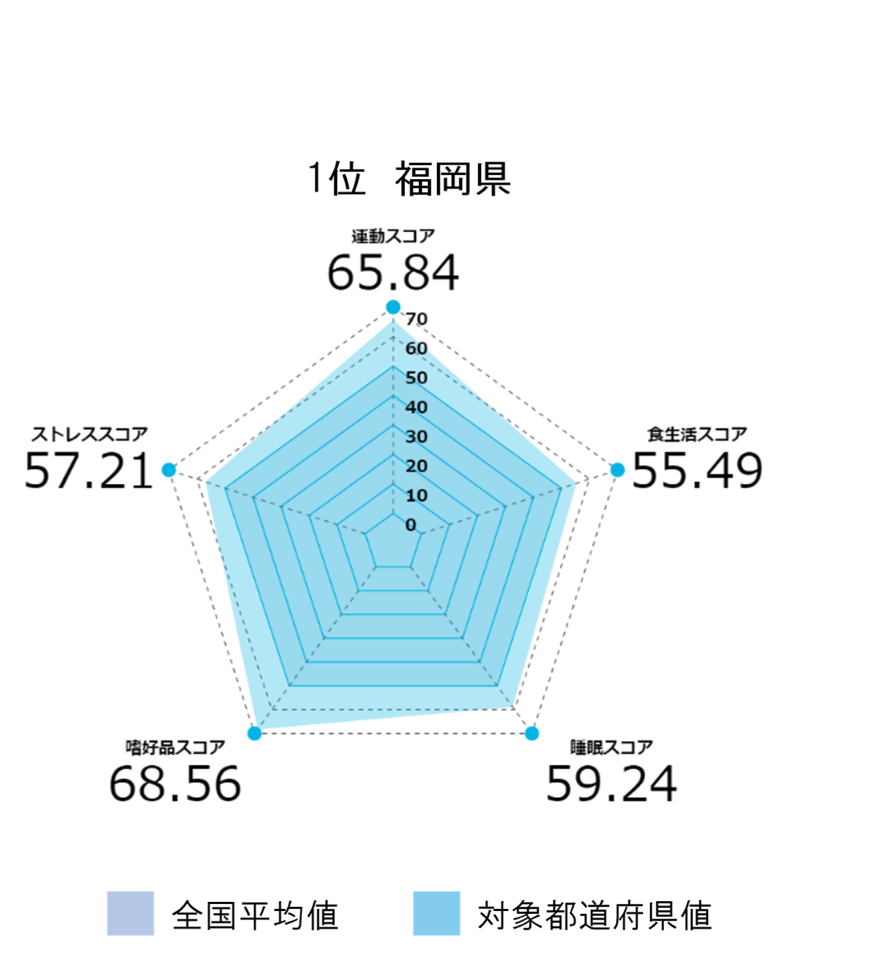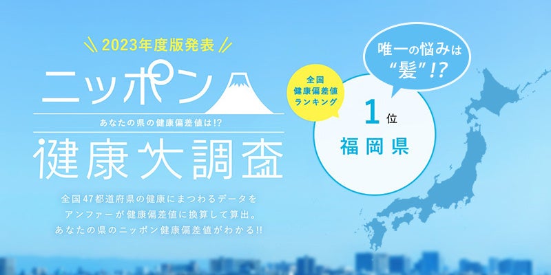 ニッポン健康大調査(以下、本調査)とは、全国47都道府県各100人(男女50:50、20代~60代まで各10人)合計4,700人を対象に、個々人の生活習慣の行動や、将来の健康に関する考えなど、“未病対策に対する考え方や行動”の調査です。人生100年時代の到来を見据え「予防医学」や「未病対策」というキーワードが重要視され、人々の健康に対する関心度が高まっています。アンファーは、個人の健康に対する意識や、健康的な生活習慣の行動変化を指標化し、未病改善の普及啓発につなげることを重要なミッションであると捉え、2017年より日本全国を対象とした一斉調査を開始いたしました。2023年の本調査では、健康な都道府県として、福岡県が初の全国1位を獲得いたしました。
