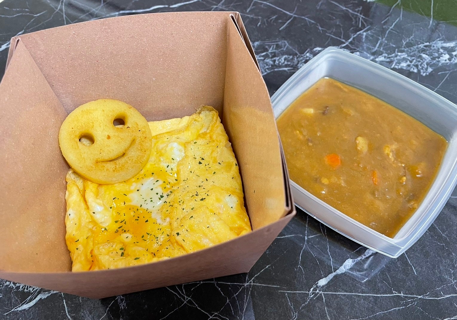 お子様が大好きなオムカレー。少し甘めのカレールーをたっぷりかけてお召し上がりください。野菜もお召し上がりいただけるよう、ご飯にきのこバターを混ぜ込みました。6/21初回のお弁当はこちらをご提供いたします。