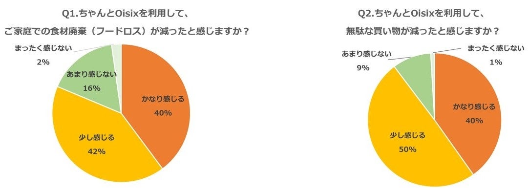 昨今原材料価格の高騰や円安の進行などにより物価高騰が長らく続いており、2023年6月もさらなる値上げが予定されています。加えて、コロナ禍を経て持続可能な社会に対する意識が高まっており、「フードロス削減」や「生活防衛」をうたうサービスや商品への支持が広がっています。「ちゃんとOisix」を毎週利用するお客様にアンケートを実施したところ、82%が「家庭での食材廃棄(フードロス)が減った」(Q1)、90%が「無駄な買い物が減った」と回答(Q2)※。必要分の食材とレシピがセットになって届くことで食材が余らないことに加え、買い物の回数が減ることにより、家庭内フードロスの削減や食費の節約につながる点が評価され、2019年10月のサービス開始以来、利用者数が4.8万人を突破しました(2023年5月25日時点)。さらに、レシピの中で皮つきのままの調理や無駄のない野菜の切り方提案があることでも、フードロスの削減に貢献しています。