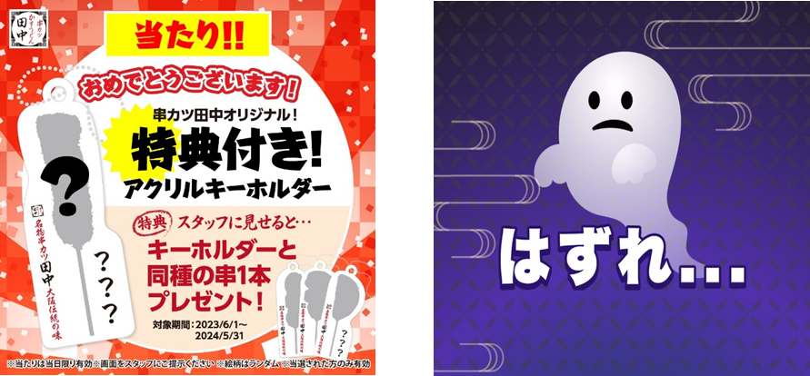6月12日(月)からは、「当たり」の画面が出たら、全5種類ある「特典付きアクリルキーホルダー」を1つプレゼントいたします。アクリルキーホルダーにはそれぞれ串カツがプリントされており、スタッフにご提示いただくと、同種の串カツを1本プレゼントいたします。