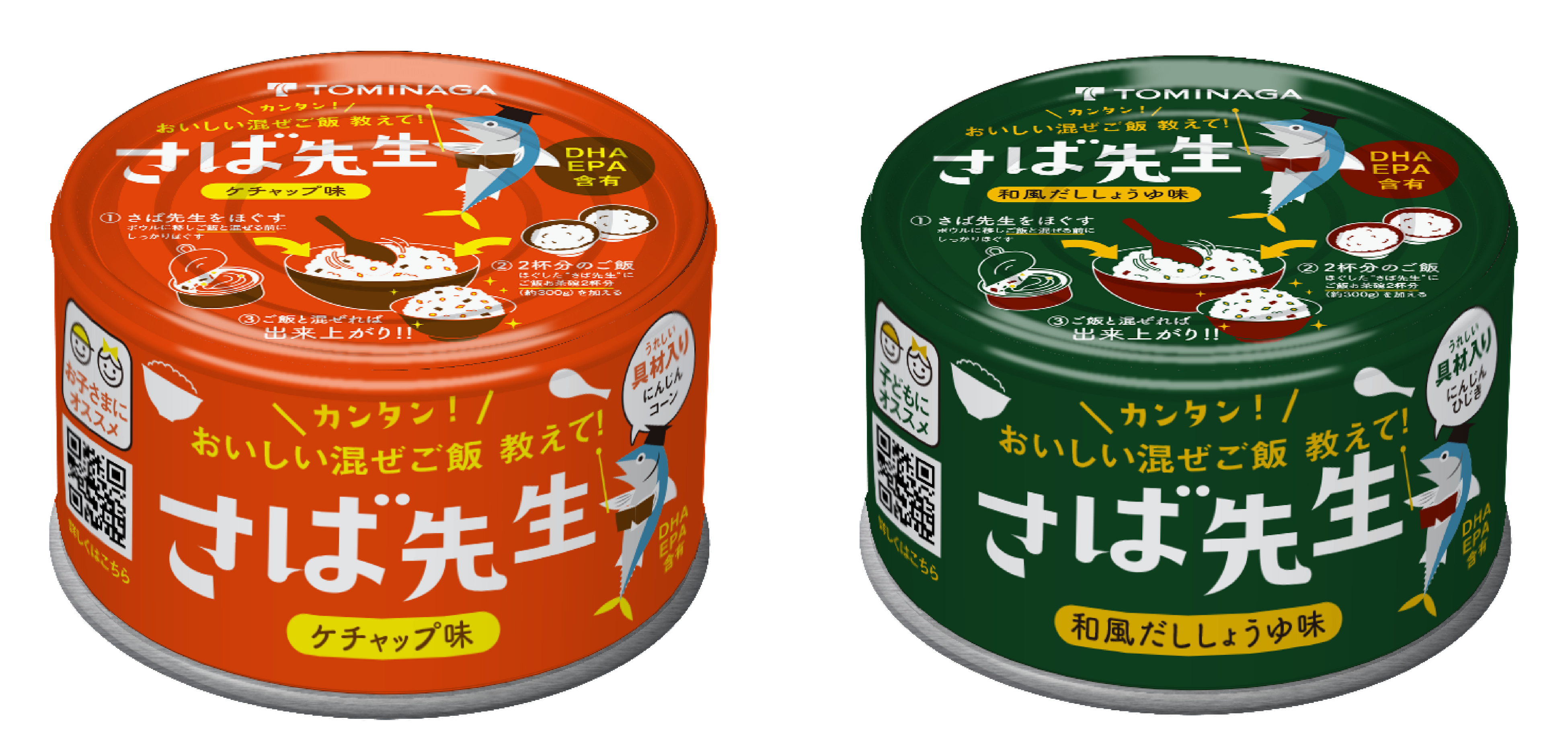 2023年3月8日(サバの日)に富永貿易株式会社より発売された、ほぐしてごはんと混ぜるだけで簡単にさば混ぜご飯ができる新しいタイプのサバ缶詰です。子どもにもっと魚を食べてもらいたいという想いから開発された商品です。子どもが好む「ケチャップ味」(コーン・にんじん入り)と、やさしい味付けの「和風だししょうゆ味」(ひじき・にんじん入り)の2種類展開です。富永貿易株式会社は2023年に創業100周年を迎えます。当社は「食」を通じてつながるすべての皆さまにたくさんの喜びと笑顔をお届けする商品を手掛けてまいりました。「さば先⽣」は次の100年を担う⼦どもたちの幸せを想い開発したブランドです。