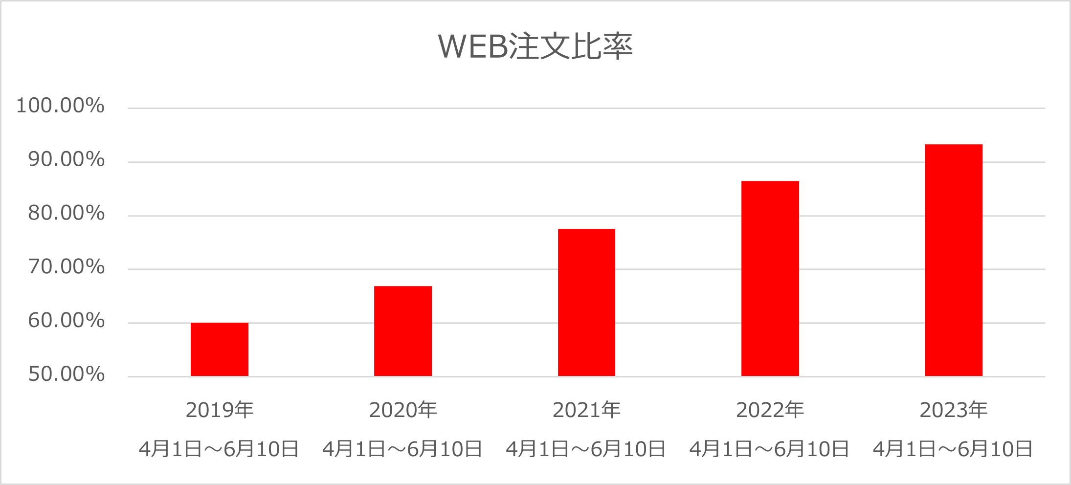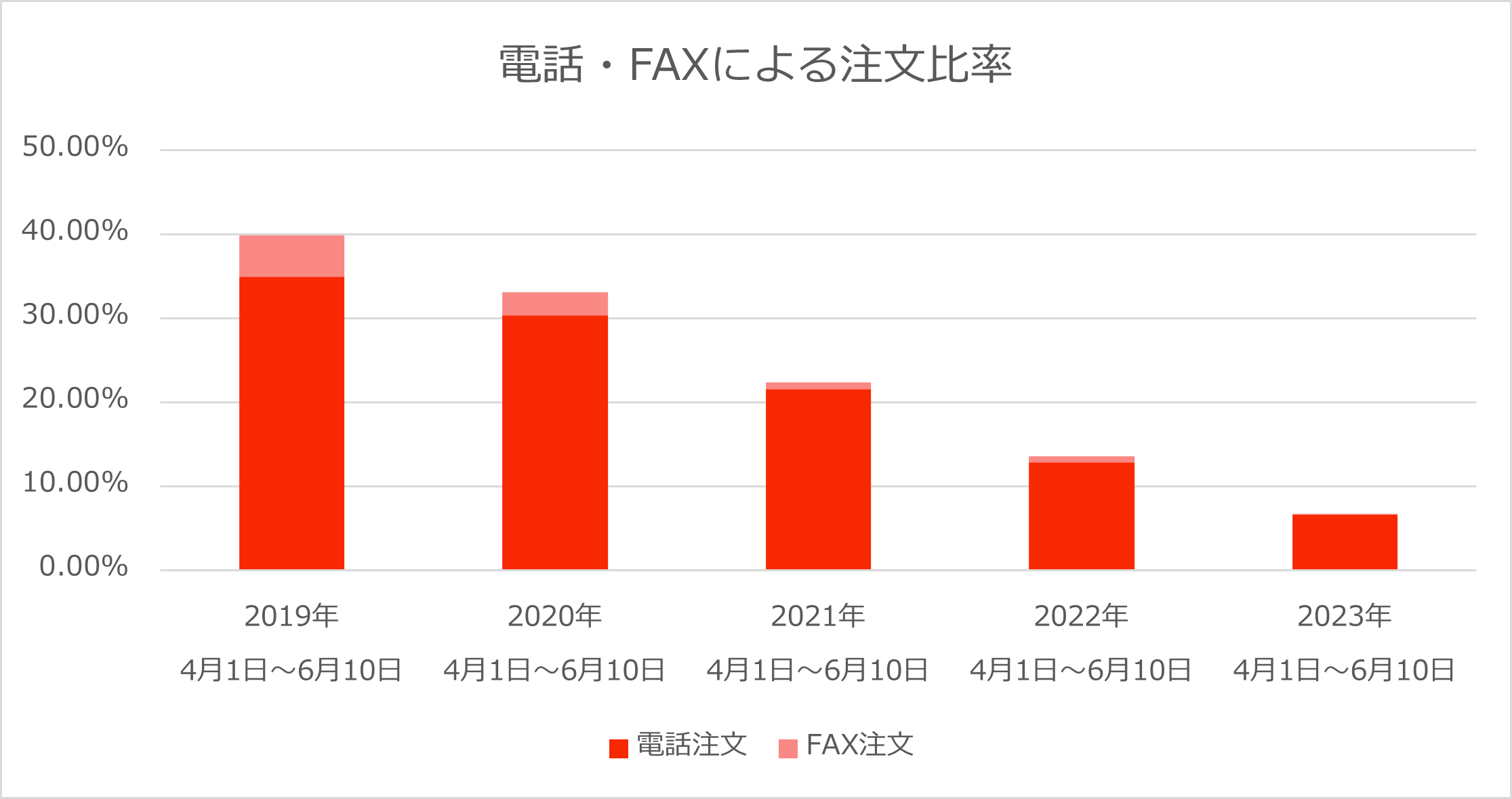 注文方法のWEB化が進むにつれ、電話やFAXを使用した注文方法は減少しており、電話による注文比率は2019年と比較し81.1%に減少、FAXでの注文は98.4%減少するなど、注文方法に大きな変化がみられました。