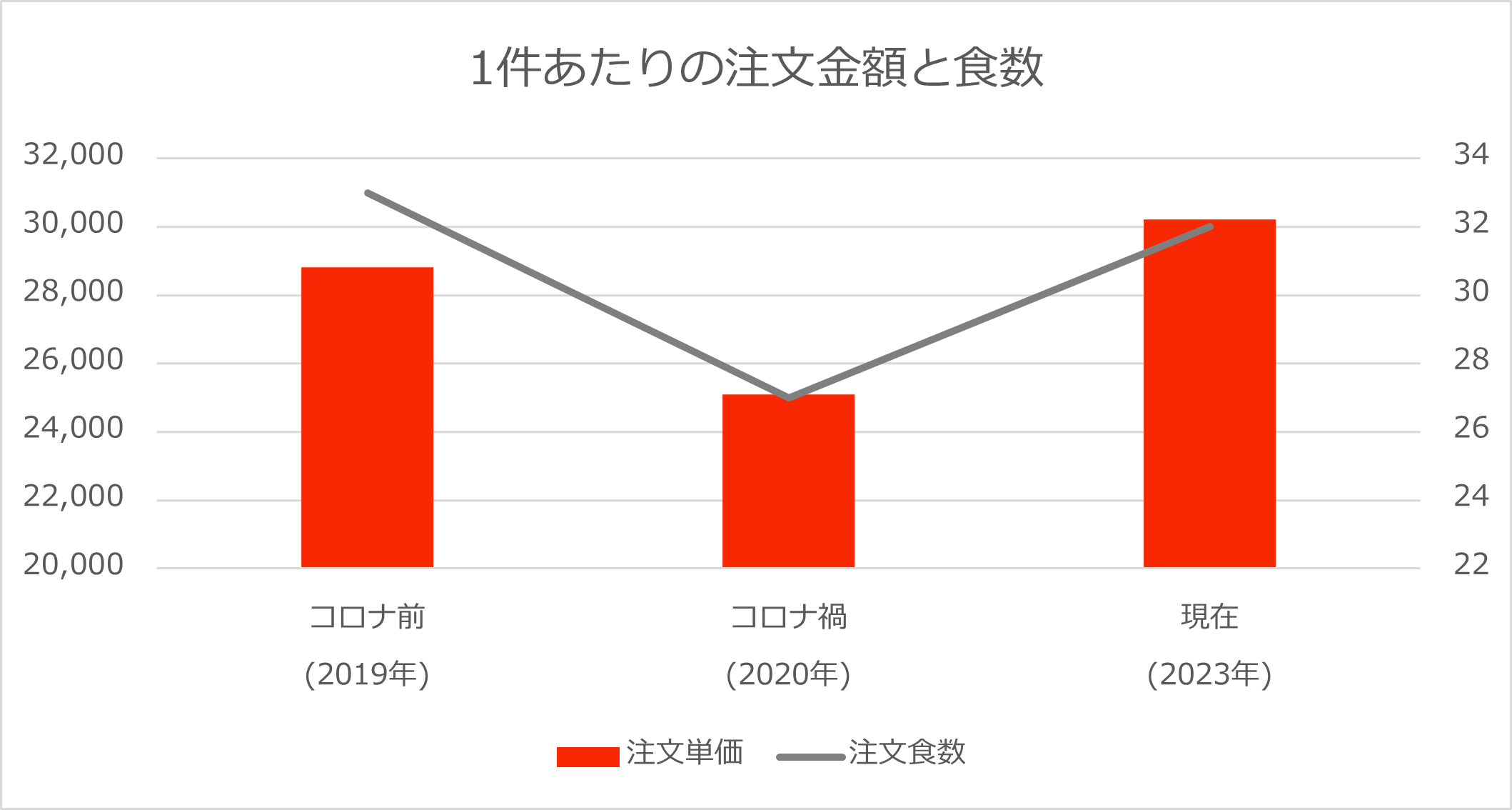 コロナの影響が大きかった2020年に減少した注文金額と食数は、2023年現在、コロナ前を上回る水準となっています。コロナ禍で減少した1件あたりの注文食数も、コロナ以前の水準まで回復しました。