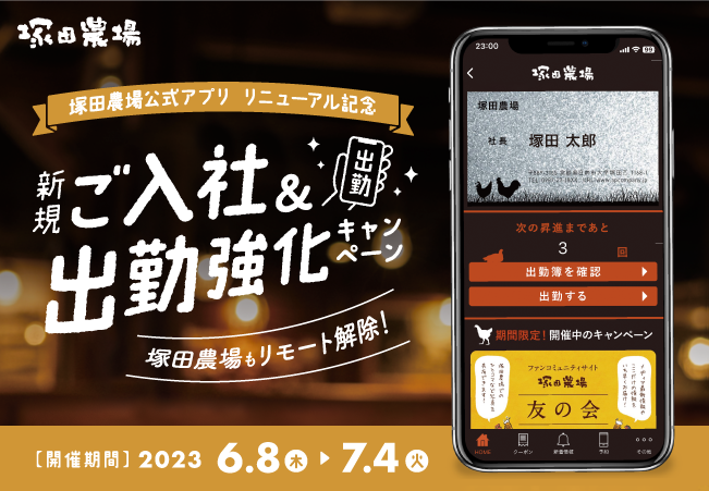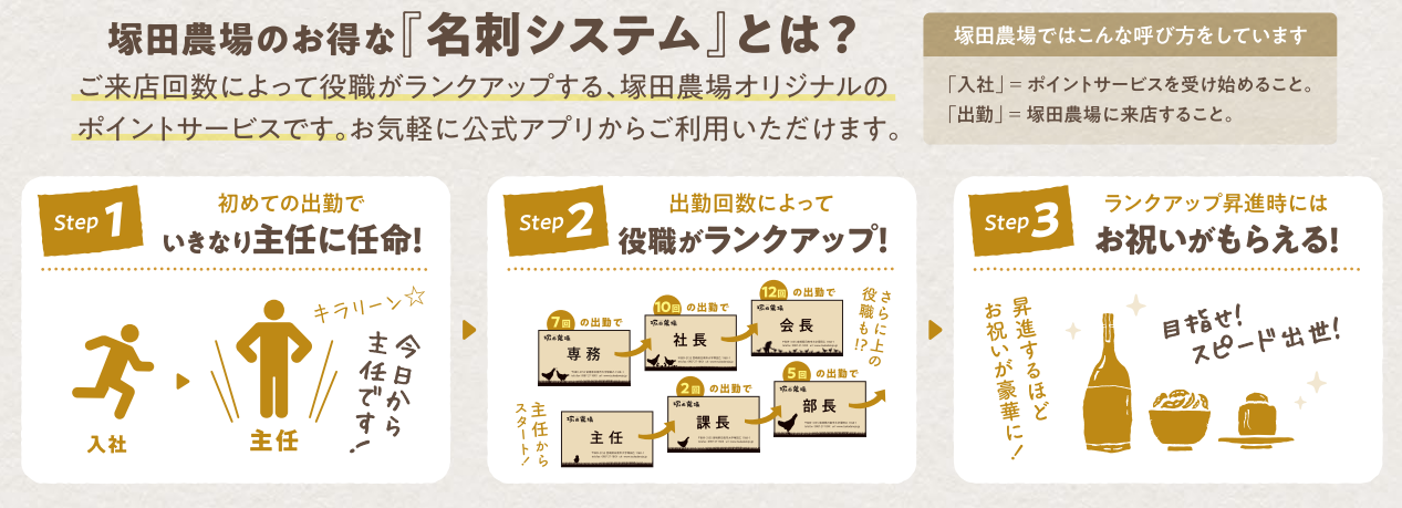来店時にQRコードを読み込むことを「出勤」と称し、会社の人事制度を模した「昇進」によって段階に応じたポイントサービスを受けられるのが、塚田農場の「名刺システム」です。