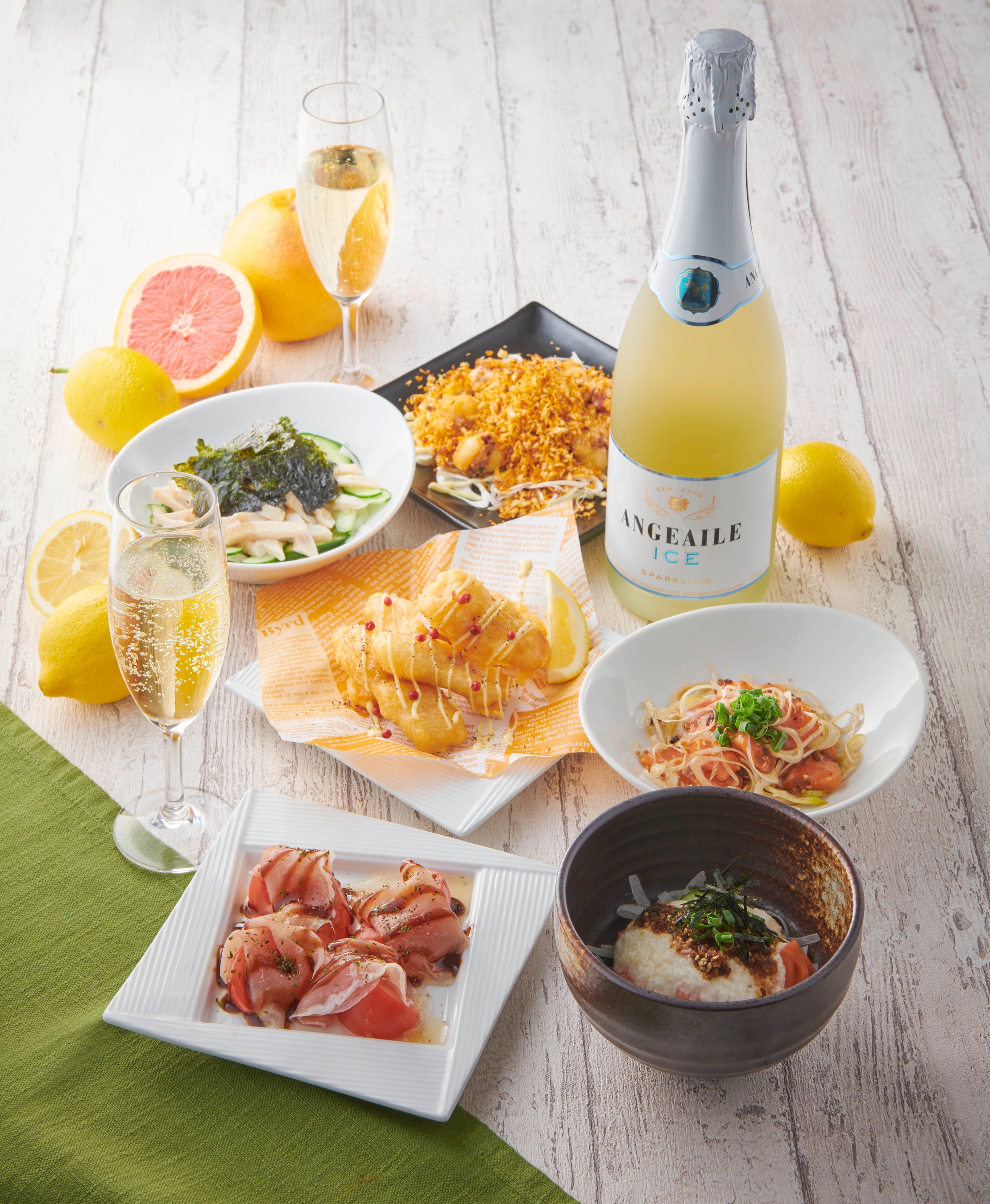 のどごし爽やかなスパークリングワインに氷を入れることでまろやかさを併せ持つカクテルが誕生しました。アンジュエールアイスに凍らせたレモンと氷をいれたイチオシ「キンキン!バブレモ548円」をはじめとし、生のグレープフルーツを絞って楽しむ「キンキン!生絞りバブグレ548円」など全5種類のキンキンに冷えたカクテルをお楽しみいただけます。さらに、バブリーカクテルやビールなど様々なお酒に合う フードメニューも同時販売いたします。アンジュエールアイスに合う「白桃ソースの生ハムトマト548円」、新食感「どっさりスパイス!タコの唐揚げ548円」や「たっぷり韓国海苔と蒸し鶏のネギ塩和え438円」など新たに6品のおつまみをご用意いたしました。ぜひ、自分だけのドリンクとのマリアージュをお楽しみください。