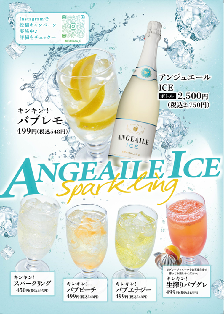 ワタミ株式会社(本社東京都大田区)が展開する『ミライザカ』の全88店舗で、2023年6月8日(木)~8月24日(木)の期間で「ANGEAILE ICE Sparkling」を使用したバブリーカクテルの販売を実施いたします。