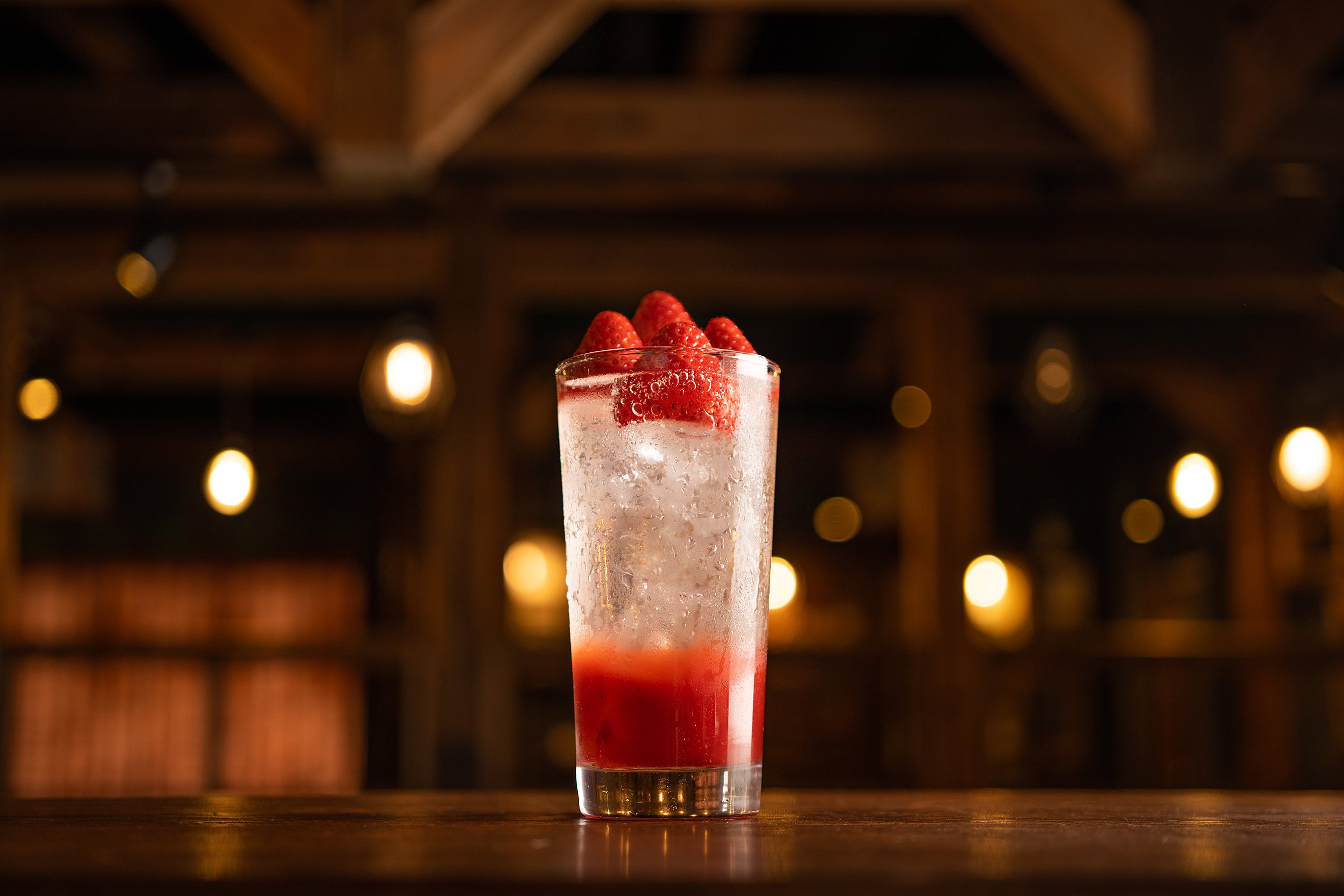 グラスから顔をのぞかせる美しい三角錐のいちごは、静岡県産の「紅ほっぺ」。おいしく色づいたものを収穫し、フレッシュな状態で凍らせています。紅ほっぺの甘酸っぱさが一層引き立つよう、グラスの底のいちご果汁には日向夏シロップを忍ばせました。