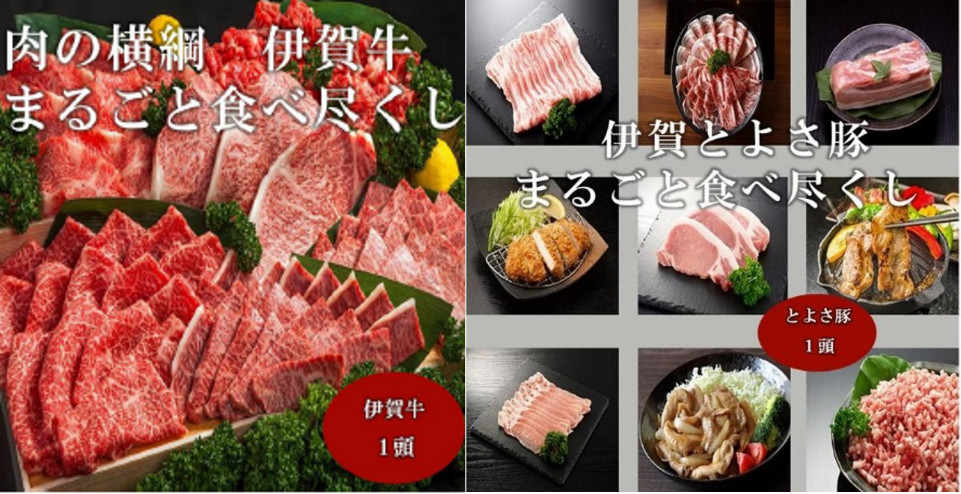 伊賀市が誇るブランド肉「伊賀牛」「伊賀とよさ豚」のそれぞれ1頭分の精肉を返礼品とするもので、寄附金額は「肉の横綱 伊賀牛まるごと食べ尽くし」が1000万円、「伊賀とよさ豚まるごと食べ尽くし」が33万4000円です。