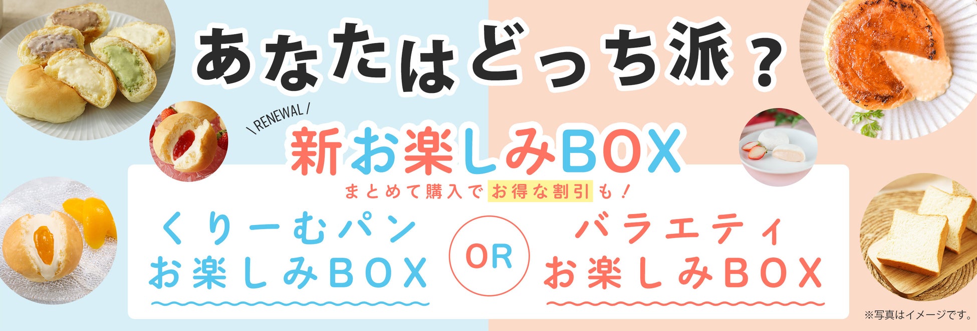 『お楽しみBOX』は、くりーむパンのみを楽しみたい方向けの「くりーむパンお楽しみBOX」と、「バラエティお楽しみBOX」の2種類をラインナップしています。