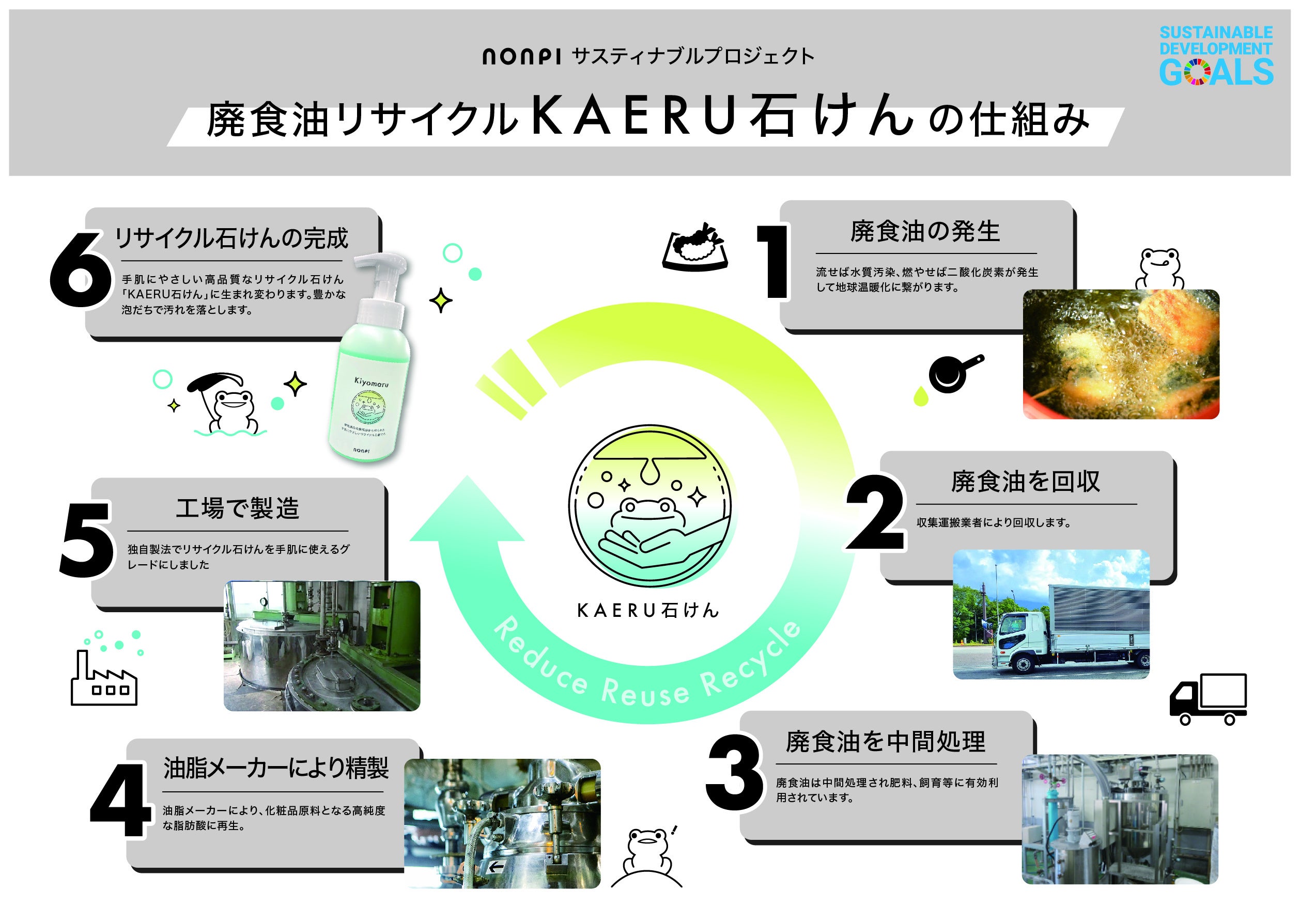 ノンピは食事事業で排出された廃食油を石鹸にリサイクルする取り組みをエスケー石鹸株式会社と連携して行っています。回収された廃食油は独自のリサイクルシステムによりリサイクル石鹸「KAERU石鹸」として生まれ変わります。