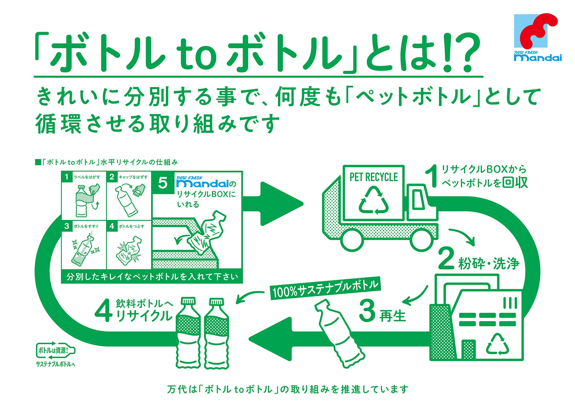 万代の対象店舗で回収した使用済みペットボトルを当社の飲料用ペットボトル容器として再生・使用していきます。これにより、お客さまのご協力により集められた使用済みペットボトルを新たなペットボトルに生まれ変わらせる、「ボトルtoボトル」水平リサイクルを実現します。また、万代では、お客さまの水平リサイクルの取り組みへの参加促進を目的に、売り場と連動した取り組み告知を順次展開し「リサイクルの見える化」を推進して、地域のお客様と共に、資源の有効活用を推進します。